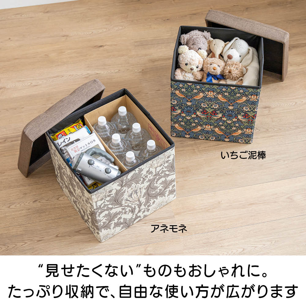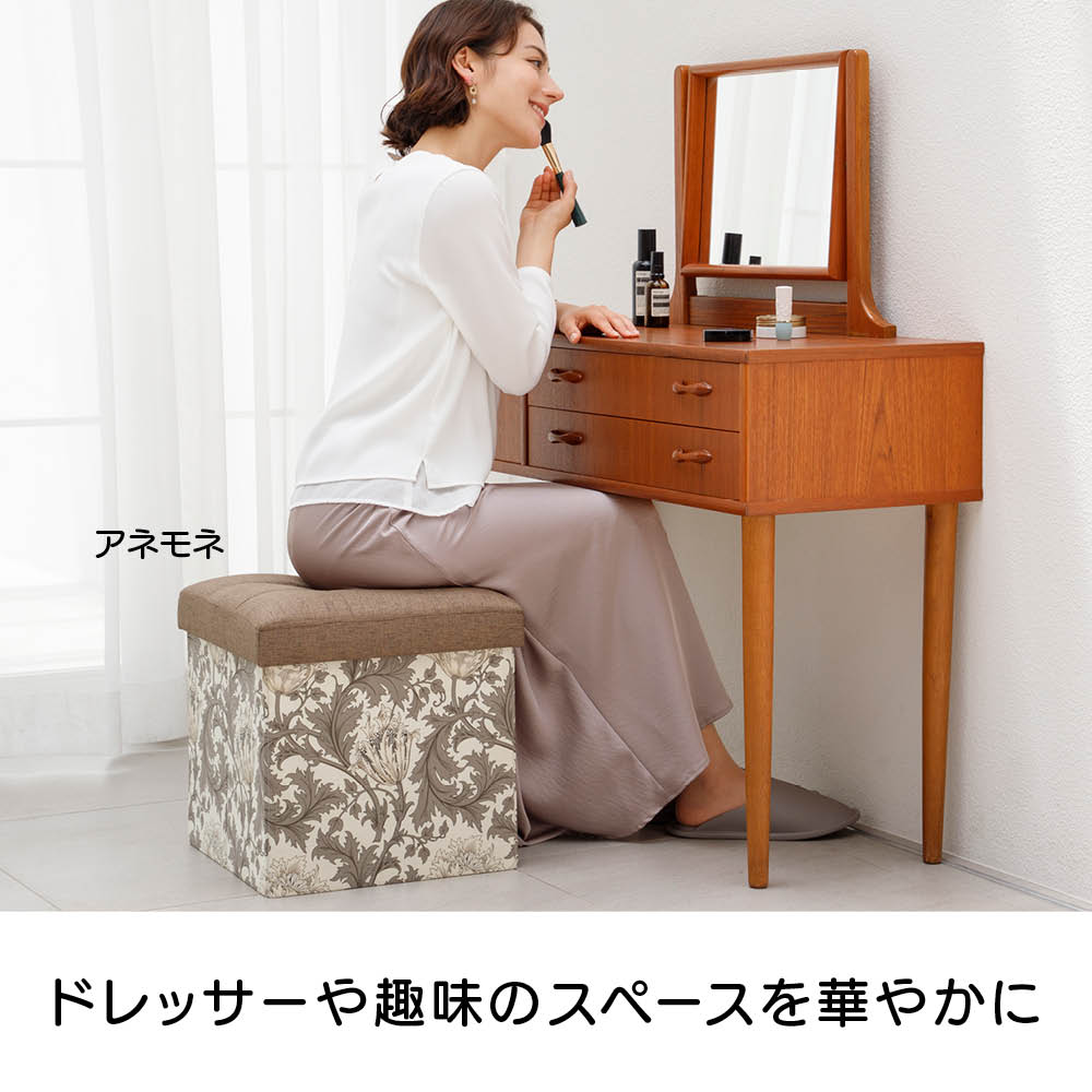 ドレッサーや趣味のスペースにもぴったり。モリス柄で、自分だけのひとときを華やかに彩ります。座れて、しっかり収納もできるボックススツールです。