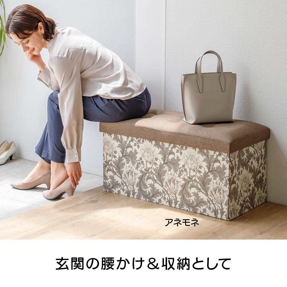 玄関の生活感を隠しながら、靴の脱ぎ履きや荷物置きにも便利。英国伝統のモリス柄で、玄関を上品に彩ります。