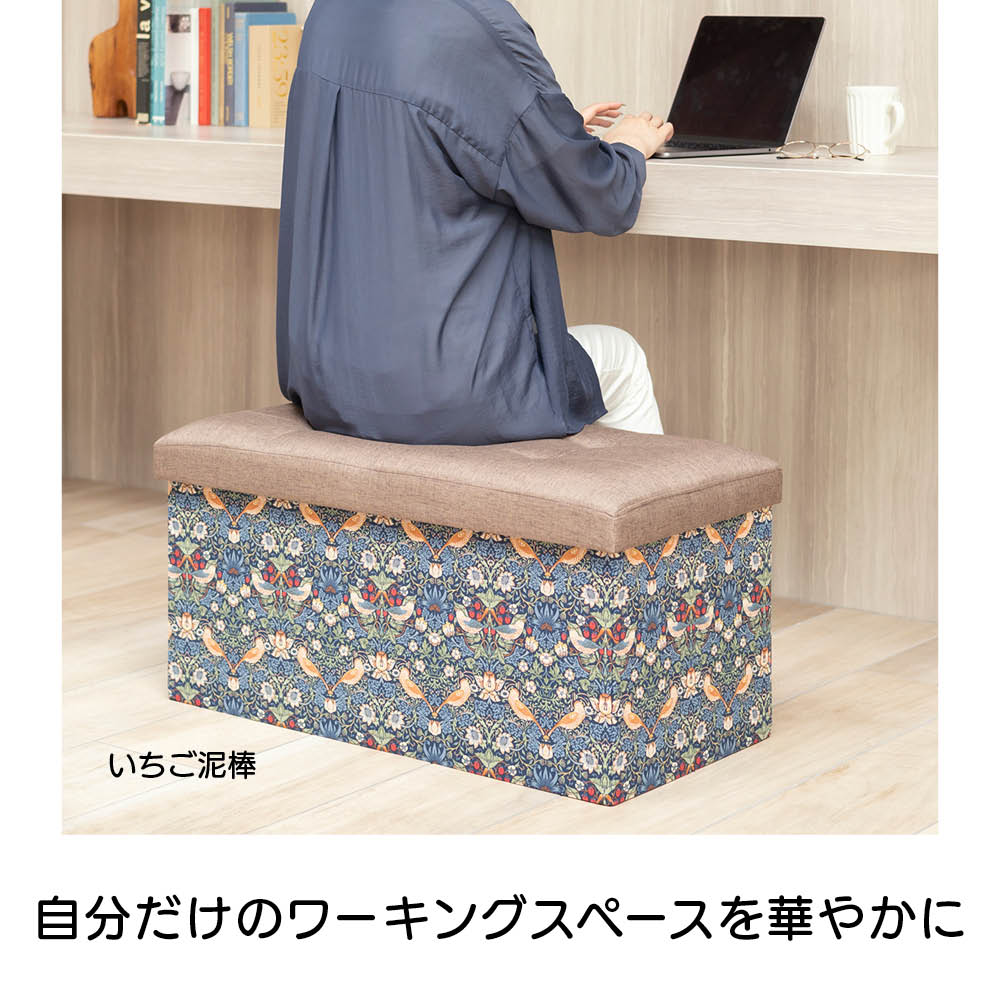 ドレッサーや趣味のスペースにもぴったり。モリス柄で、自分だけのひとときを華やかに彩ります。座れて、しっかり収納もできるボックススツールです。