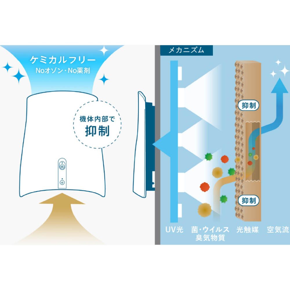 オゾンや薬剤を外に放出せずにニオイの原因を抑制する、サンスター独自の「UV×光触媒技術」を採用。薬剤不使用だから、ペットや赤ちゃんのいるご家庭でも安心してお使いいただけます。