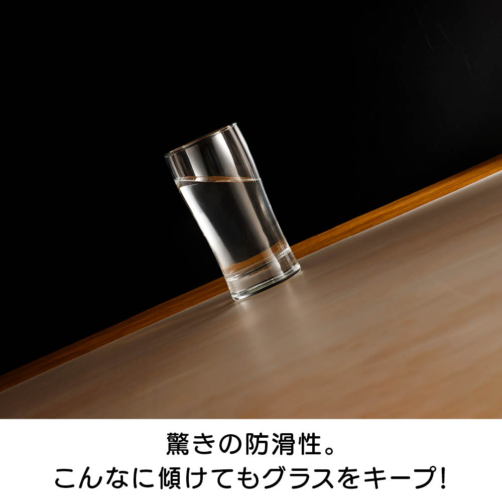 シートを敷いたテーブルを傾けても、グラスが滑らずしっかりキープ。高い防滑性で、歩いても滑りにくい仕様です。