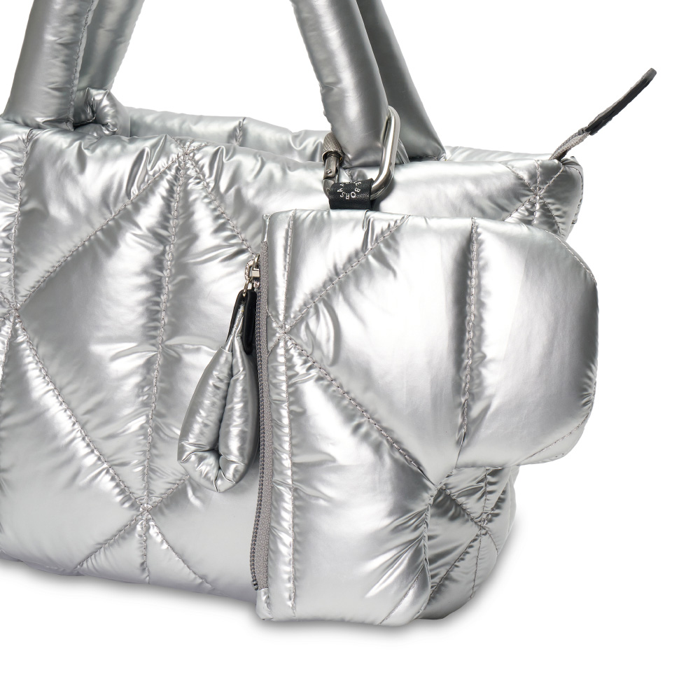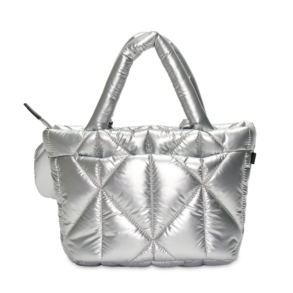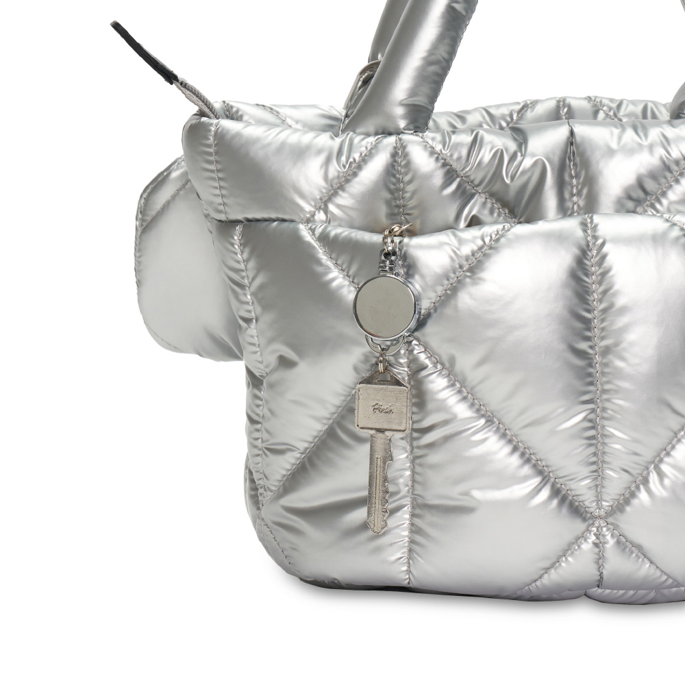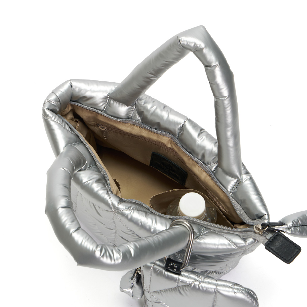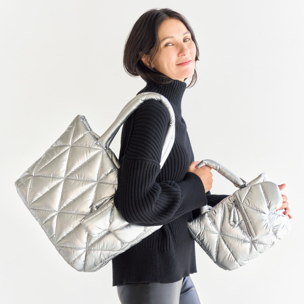 持っているだけで幸せ気分になる、ボリューミーなキルティングバッグ。軽くてたっぷり収納できて便利。シルバーメタリックの輝きで、上品で洗練されたカジュアル感を演出します。S・Lの2サイズ展開。シンプルな装いも華やかに!