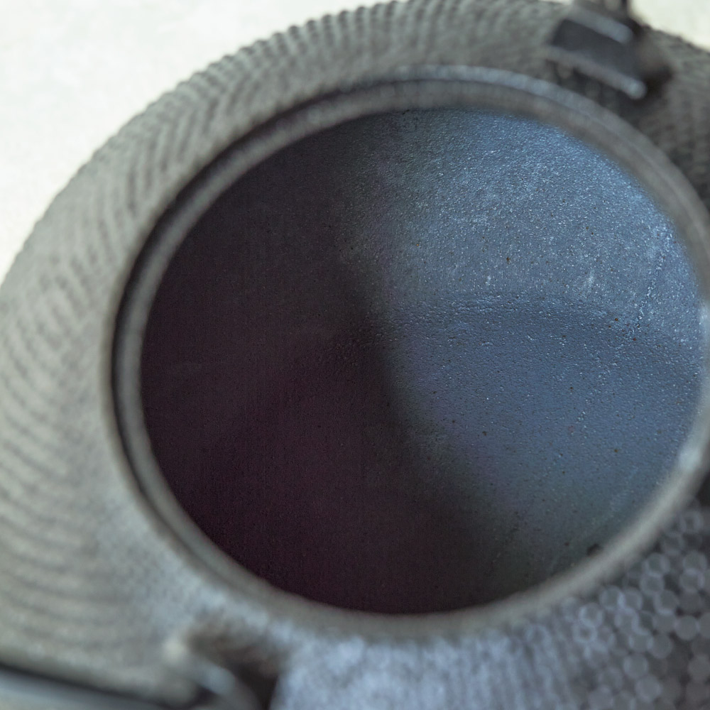 ・1.4Lタイプ:こちらの画像は1.4Lタイプの内側です。こらの内側は高温で焼き、酸化被膜を育てる伝統の釜焼き仕上げ。使用後は毎回空焚きで水分を完全に飛ばすのが長く使うコツです。・1.2Lタイプ:内側は釜焼き仕上げではありませんが、湯沸かし後に蓋を開けてしっかり乾燥させればサビを防げます。
