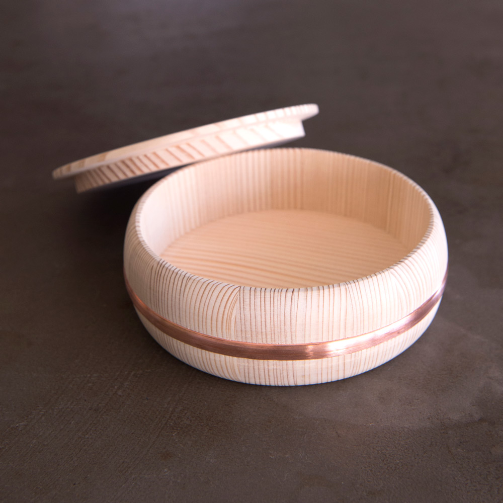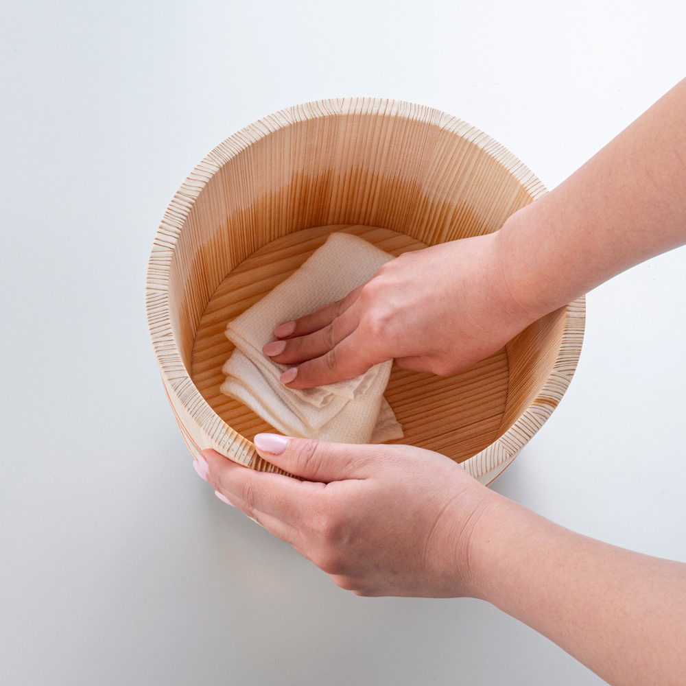 側面は吉野杉の皮に近い白太と呼ばれる部分を使用。においがつきにくく、吸湿効果に優れています。底面は耐久性が高く、水もれしにくいもみを使用。香川県で昭和30年から続く桶屋の職人が、ひとつひとつ手作りしています。商品画像の説明