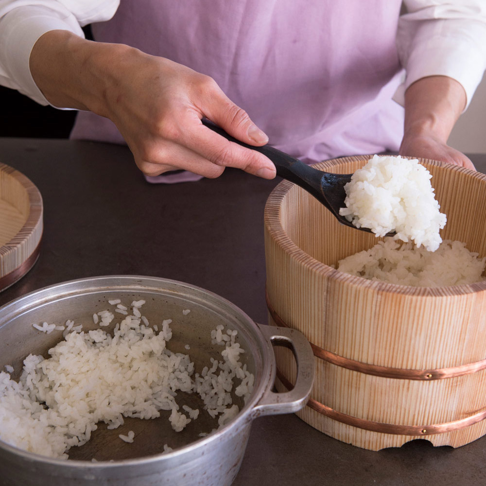 「炊き立てをおひつに移し、すぐにふたをします。こうすると木が水分調節してくれて、ごはんが本当に甘く美味しくなるんです。」
