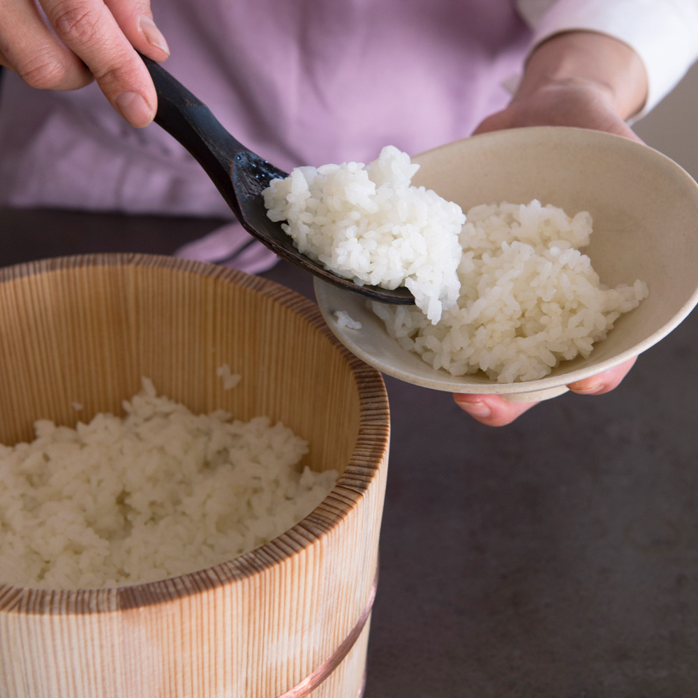 「ごはんが炊けたらおひつに移し、すぐにふたをします。こうすると木が水分調節してくれて、本当に甘く美味しくなるんです。冷めてもお米一粒一粒が立った、もっちりとした食感を楽しめます。」