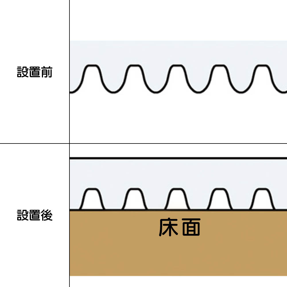 表面に微細な凹凸を施すことで、適度な密着性で床にフィットし、使っているうちにずれる心配がありません。また、密着が強すぎて剥がれないという心配もなく、床を傷めず、ストレスフリーでお使いいただけます。