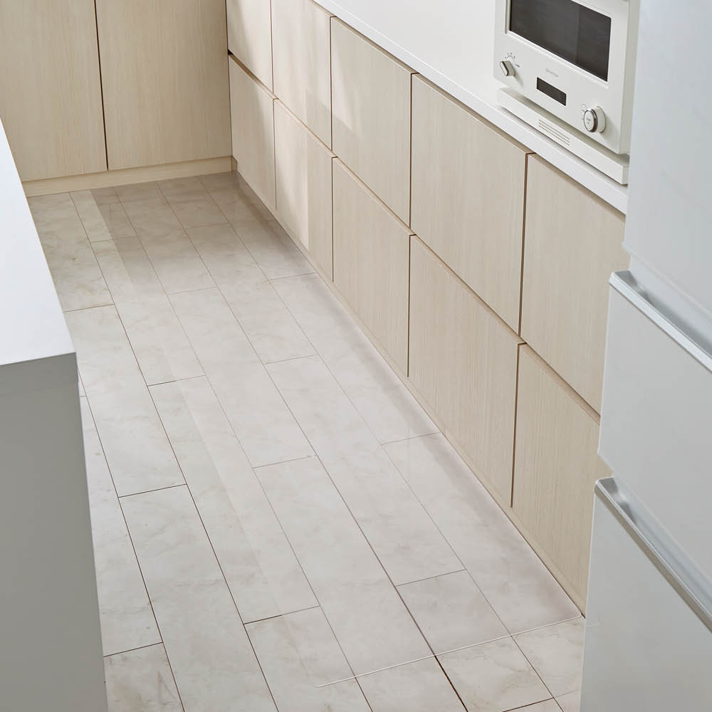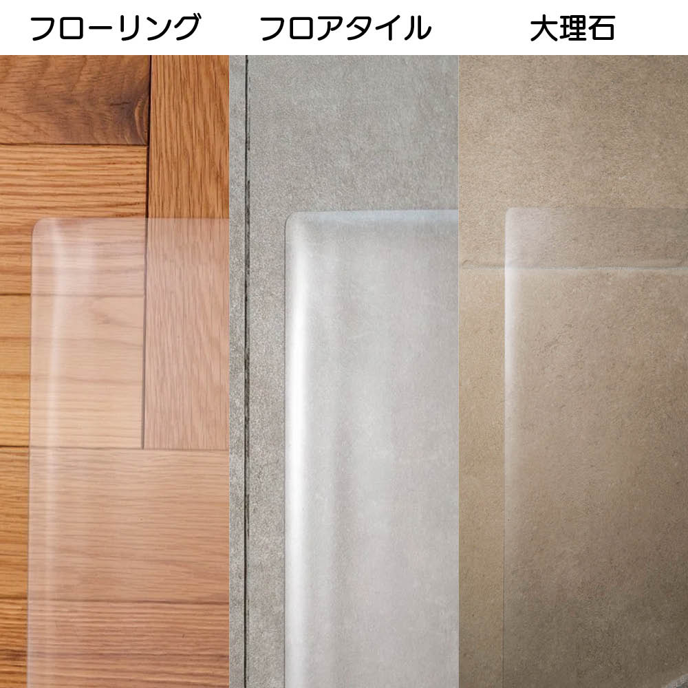 フローリングや大理石調の床の美しさをそのままに、汚れからしっかり守る透明マットです。厚さ約1mmでインテリアに馴染み、水ハネや油汚れも拭くだけ清潔。デザイン性と機能性を兼ね備えた床保護アイテムです。