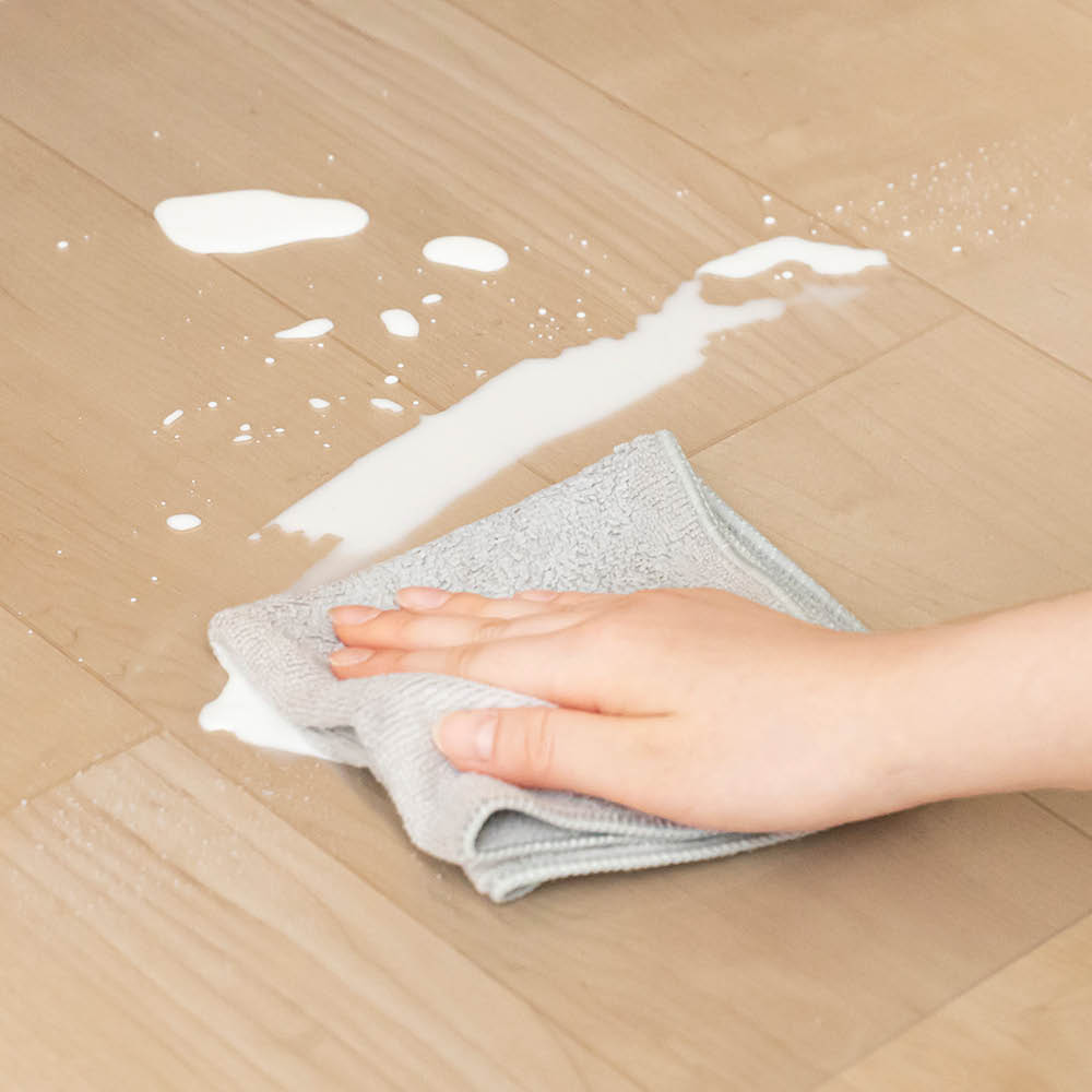 布製マットのように繊維に染み込んでシミになる心配がないので、お手入れ簡単。洗濯の手間も不要で、清潔な床を手軽にキープできます。