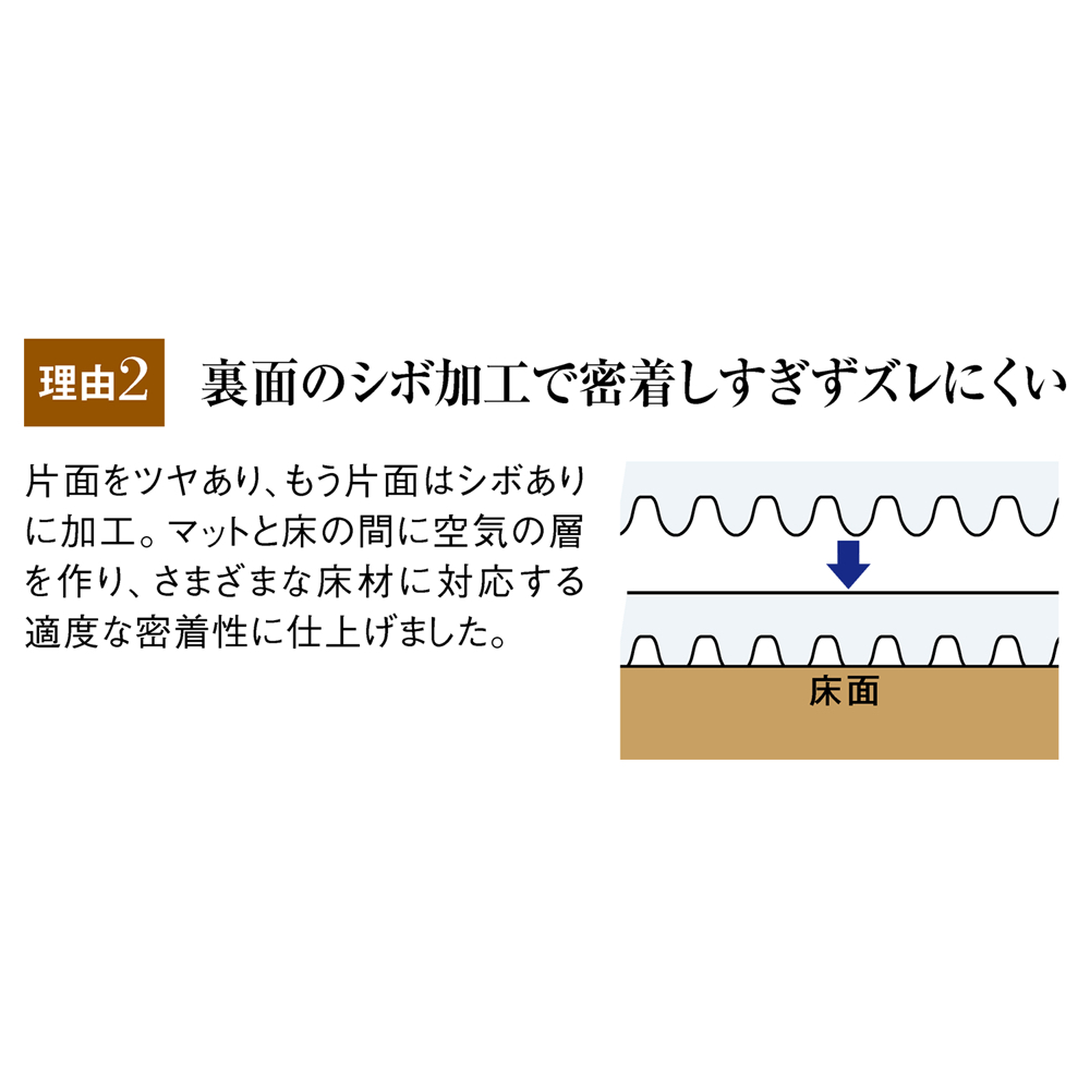 片面をツヤあり、もう片面はシボありに加工!そうすることで、マットと床の間に空気の層を作り、さまざまな床材に対応する適度な密着性にしあげました。