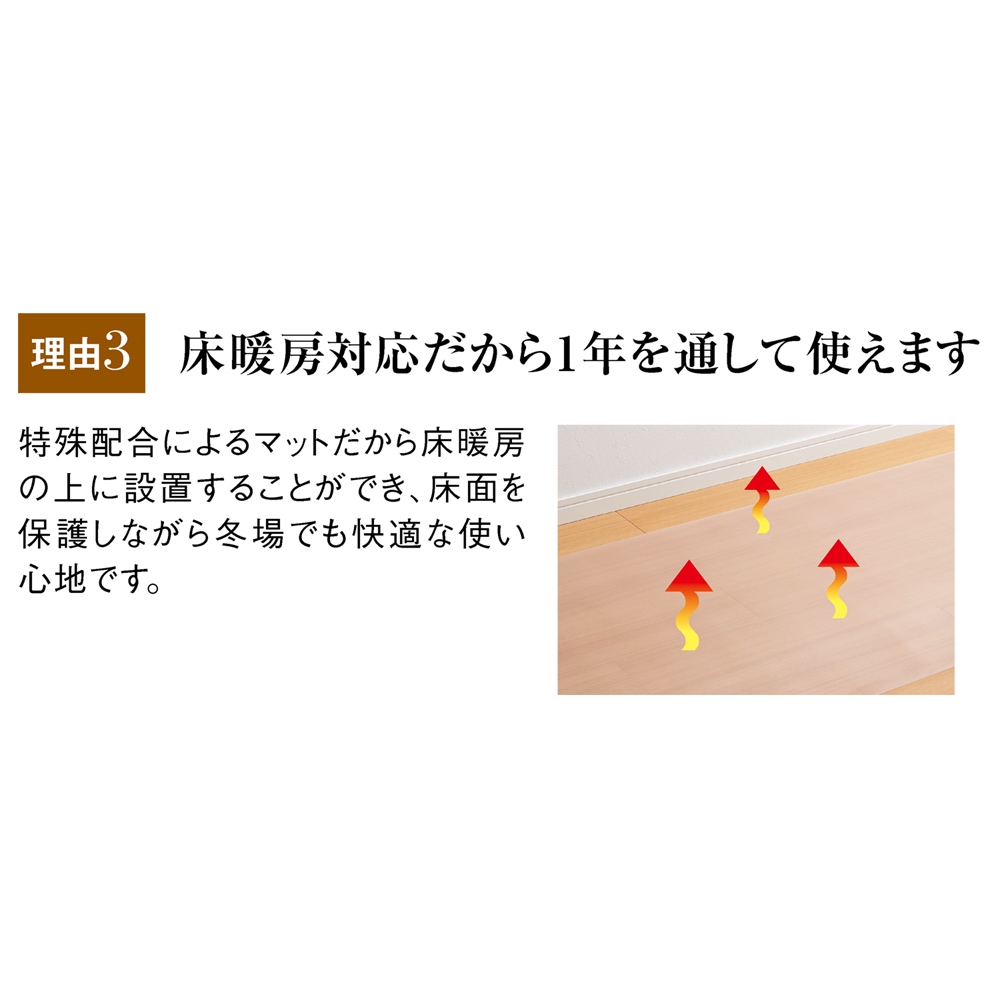 せっかくの床暖房対応のお部屋でも、透明マットを敷くことで効果が得られなければ意味がない・・・。でもディノス×アキレスの透明マットなら、特殊配合によるマットだから床暖房の上にも設置が可能!