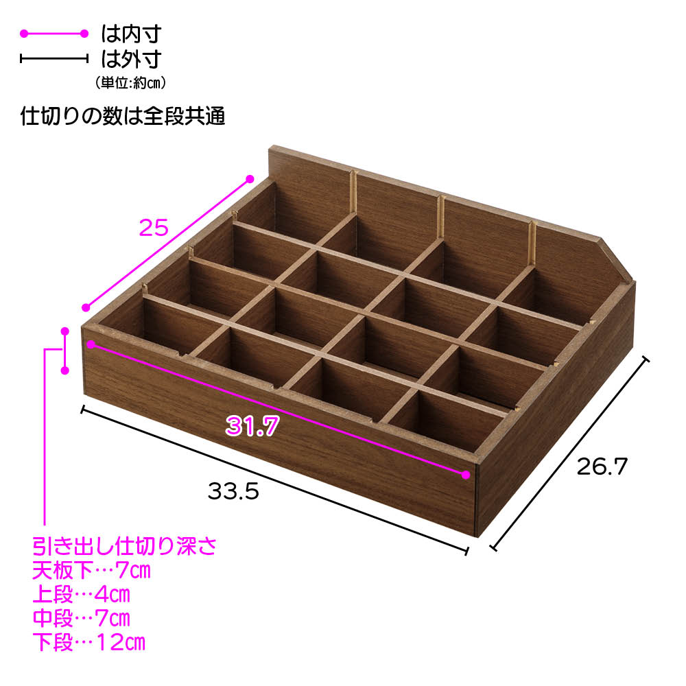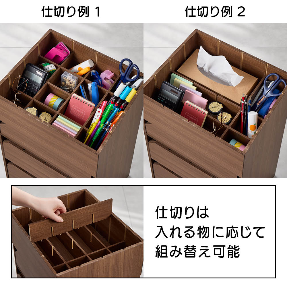 引き出しはすべて仕切り付き。一列ごとに取り外せるので、自由にカスタマイズできます。最大16分割できるから、処方薬など細かいものを分割して収納するのにも便利です。