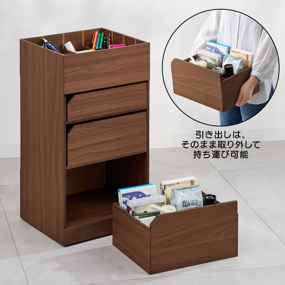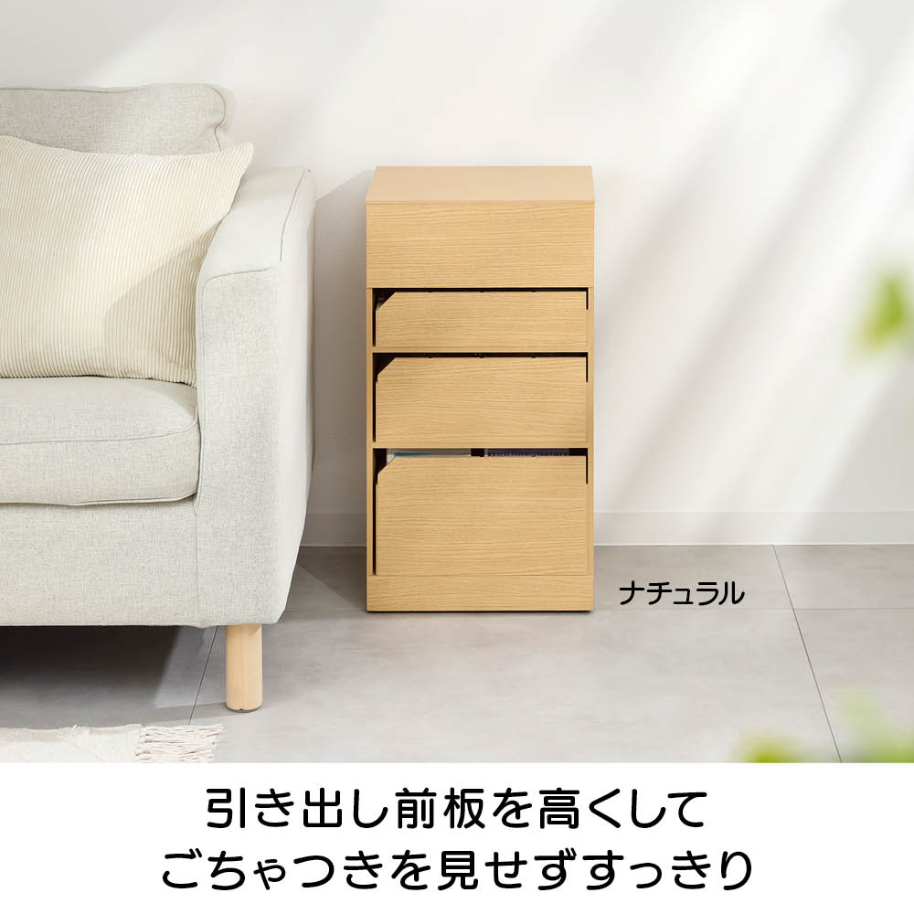 取り外し可能な天板付きなので、ソファ横に置けばサイドテーブル代わりに使えます。引き出しは片方の前板を高く、もう片方は低くしているので、中身を見せたくない場合は高い方を手前にセットすればごちゃつきを見せません。低い方を手前にセットすれば、どこに何を入れたかがわかりやすいので、入れるものや用途に応じて使い分けることができます。