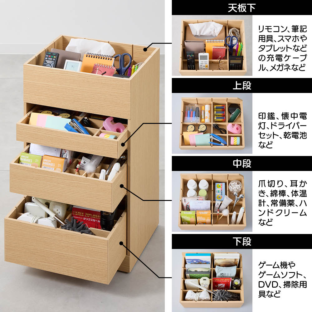 天板下には、リモコンやリーディンググラス、ティッシュ、スマホの充電器など。上・中段には常備薬や電池、文房具などを、下段には掃除道具や取説などのA4書類がすっぽり収まる深型スペースを確保。見た目以上の収納力で、使い方も広がります。