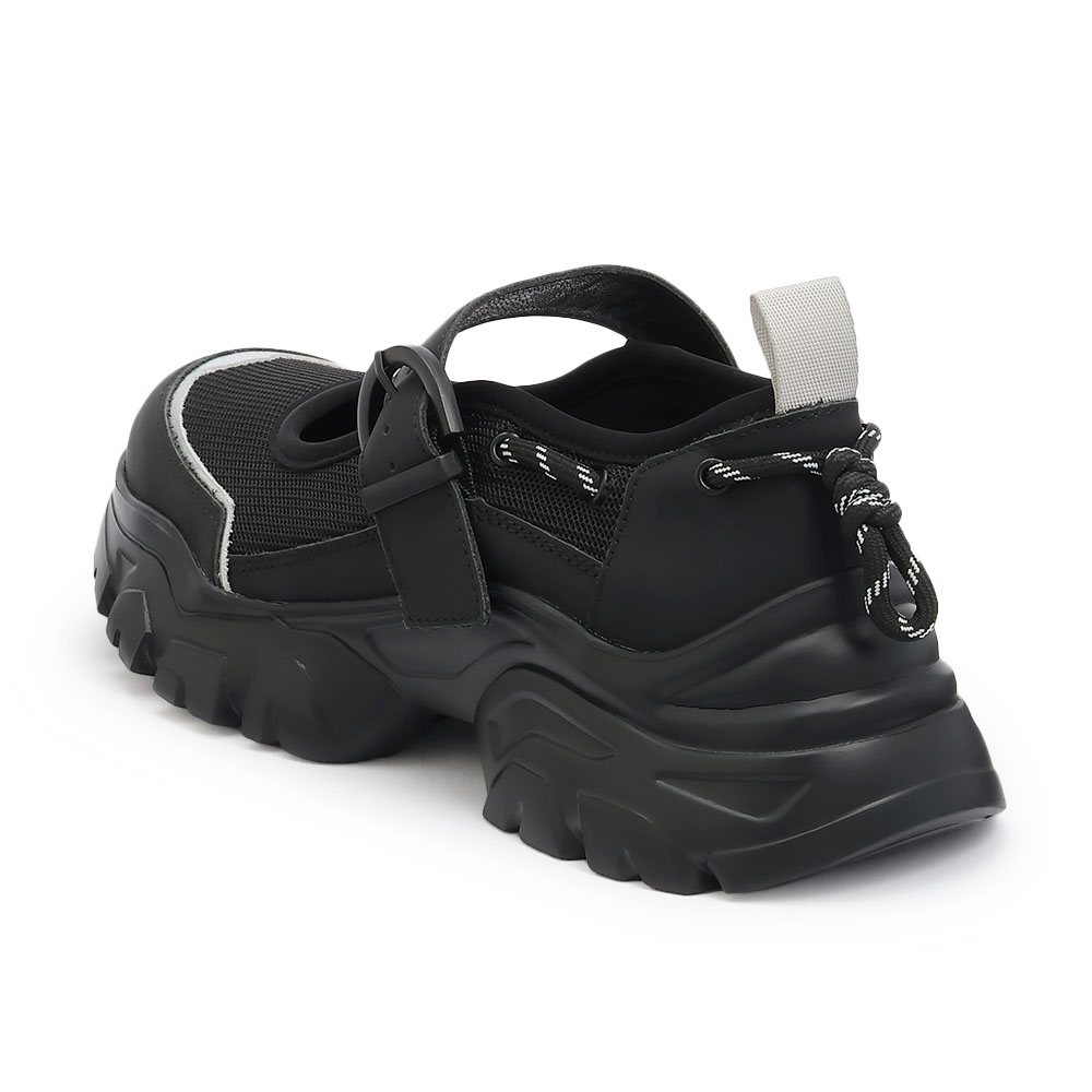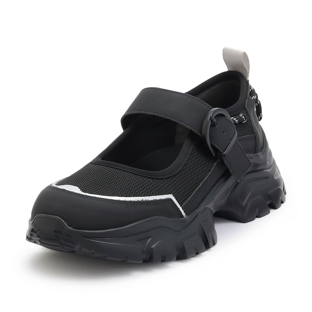 コード使いや厚みのあるソールで、アウトドアフレーバーをプラスしたワンストラップデザイン。メッシュ×床革のコンビ素材は、蒸れにくく涼やかで夏に◎。見えない部分にゴムを配した甲のストラップが、足のホールドと着脱のしやすさを約束します。商品画像の説明。