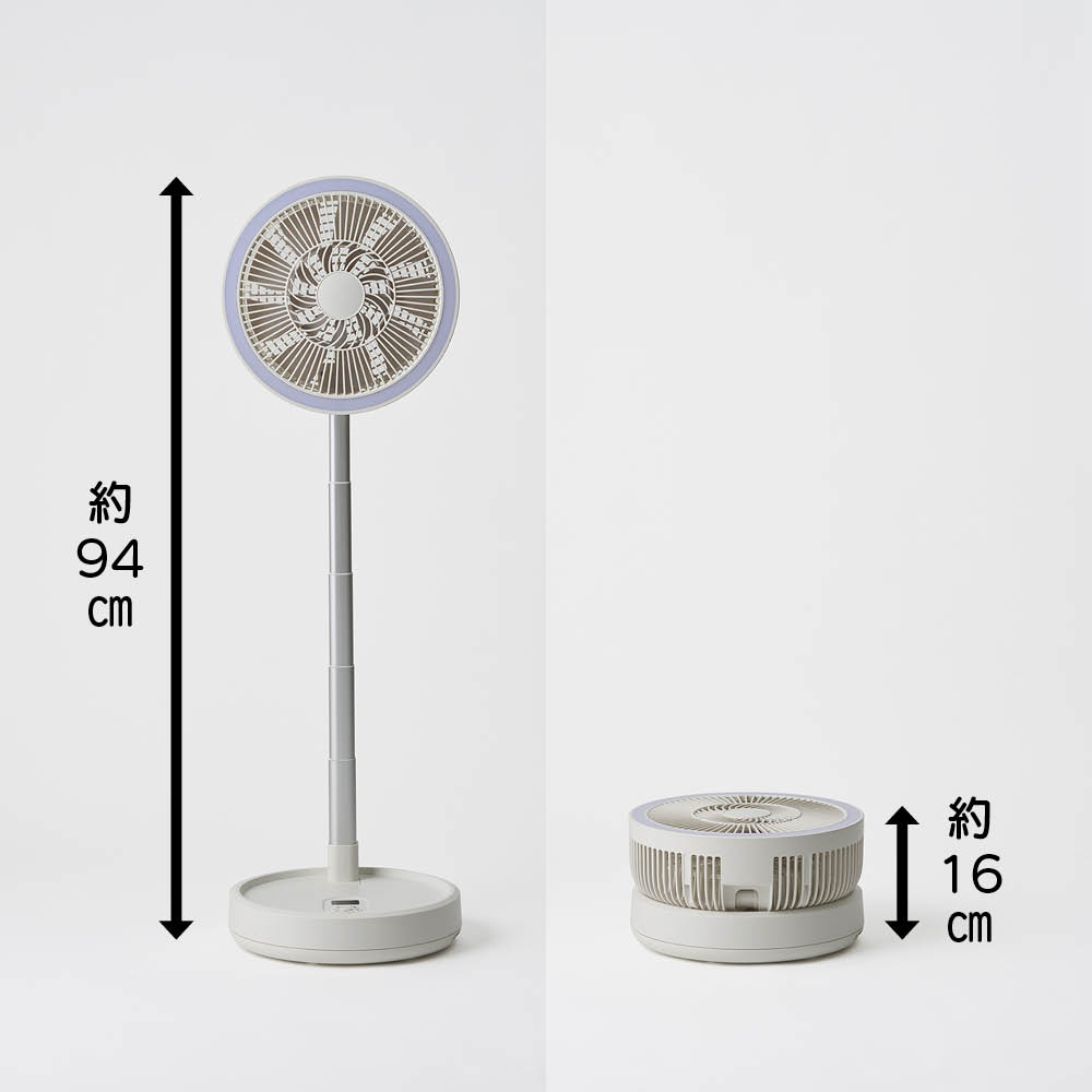高さは約48~94cmまで自由に調整でき、シーンに合わせて使いやすい設計です。最大約94cmに伸ばせば広いリビングにも風が届き、縮めれば在宅ワークのデスク上やお風呂上がりの脱衣所など限られたスペースにもぴったり。充電式のコードレス仕様で、コードが邪魔にならず見た目もすっきり使えます。LEDライト付きで非常時にも頼れる多機能ファン