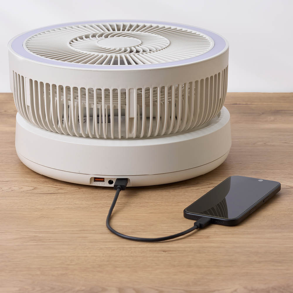 スイッチひとつでファンの周りのLEDライトが点灯。寝室のナイトライトとして使うと、夜のお部屋を柔らかく照らします。さらに充電式なので、万が一の停電時の明かりとして活躍。ライトは2段階で明るさ調節が可能、普段使いしながらも万が一に備えられるので安心です。ちょっと電源がほしいときにも役立つ、うれしいプラス機能