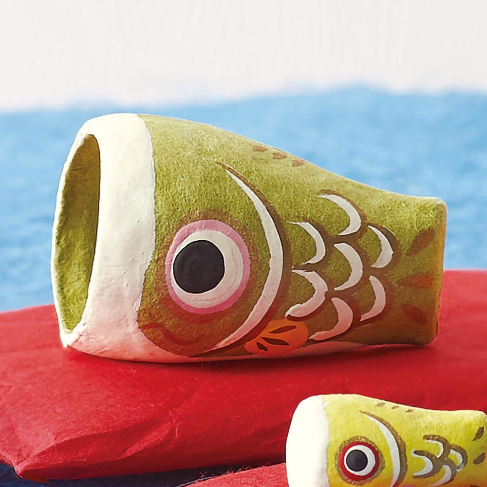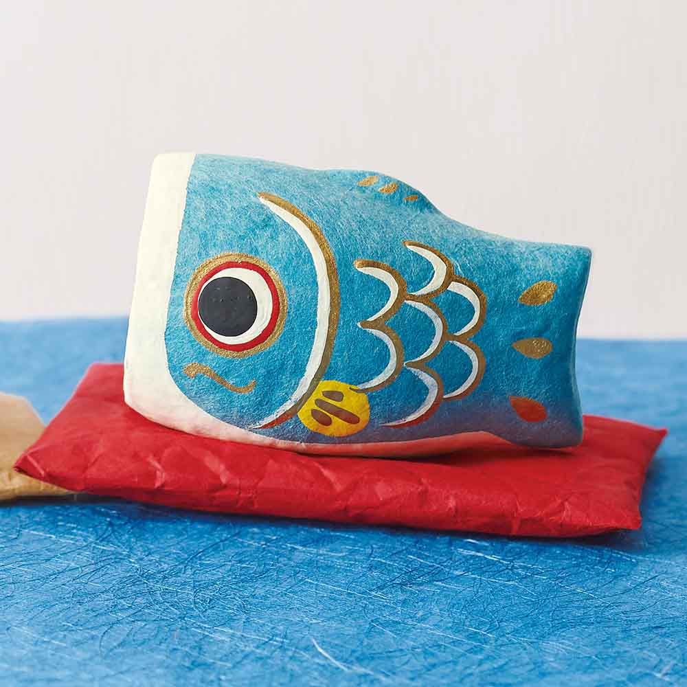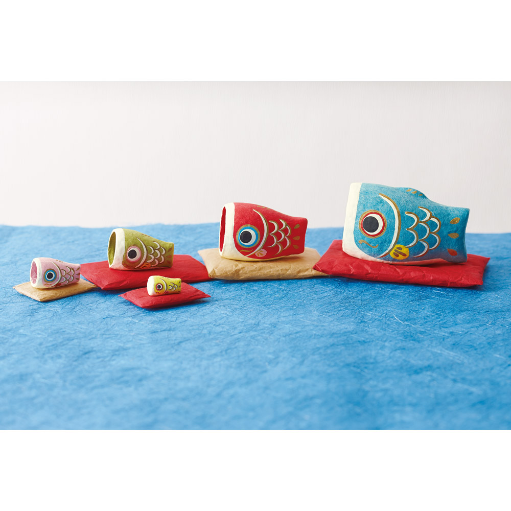 一つ一つていねいに手作りされたコロンとかわいい張り子の鯉のぼりは、付属の和紙座布団にのせて並べて飾れば個性的な節句飾りに。