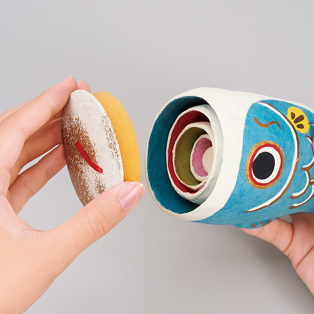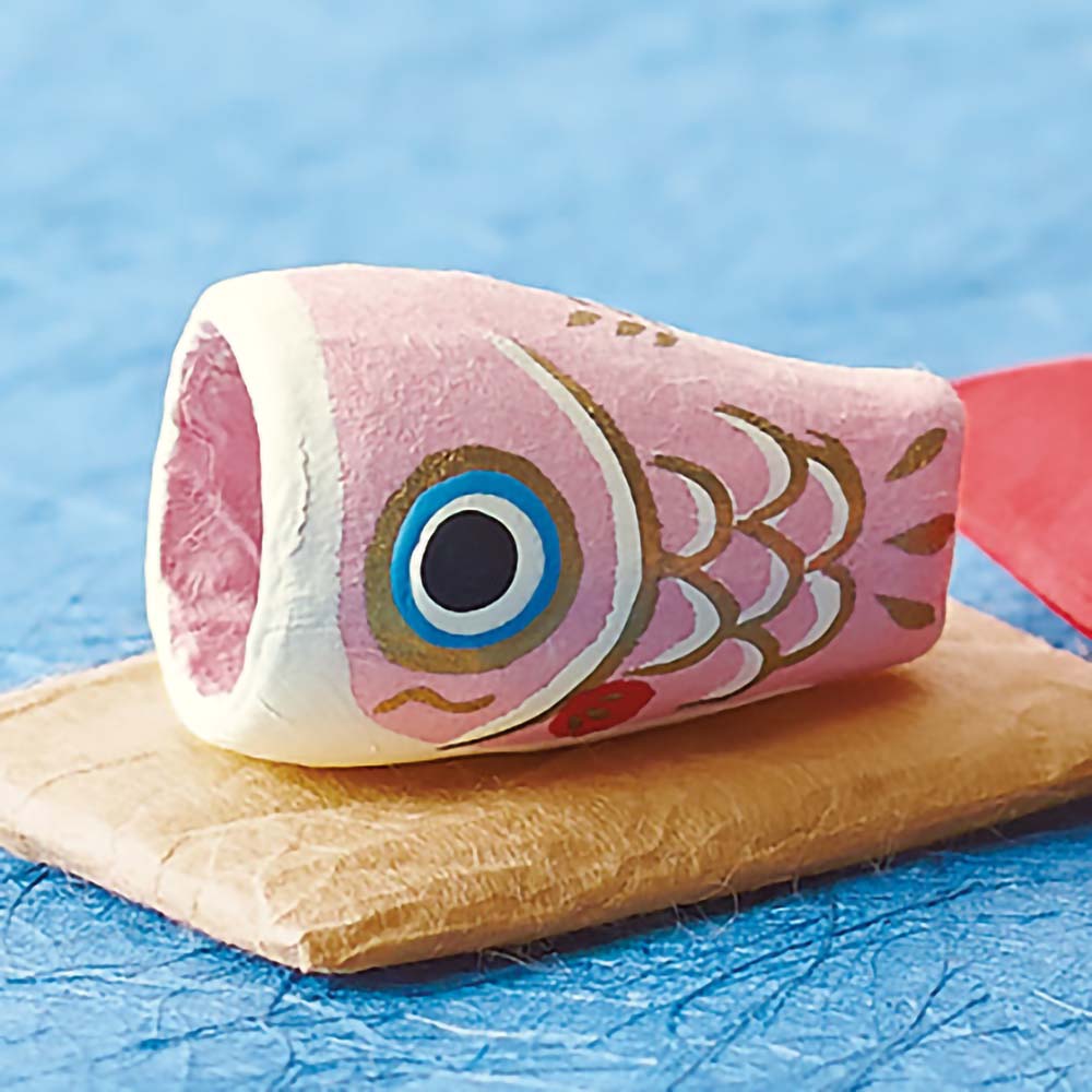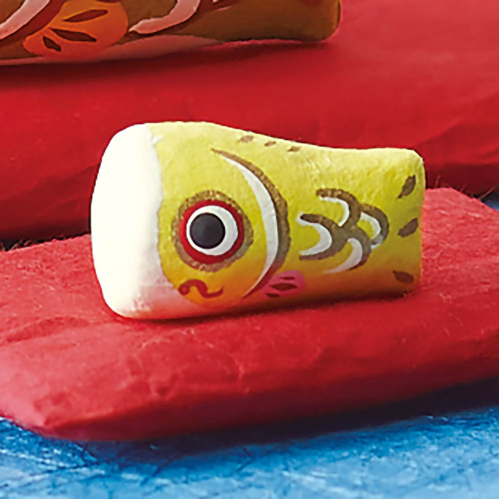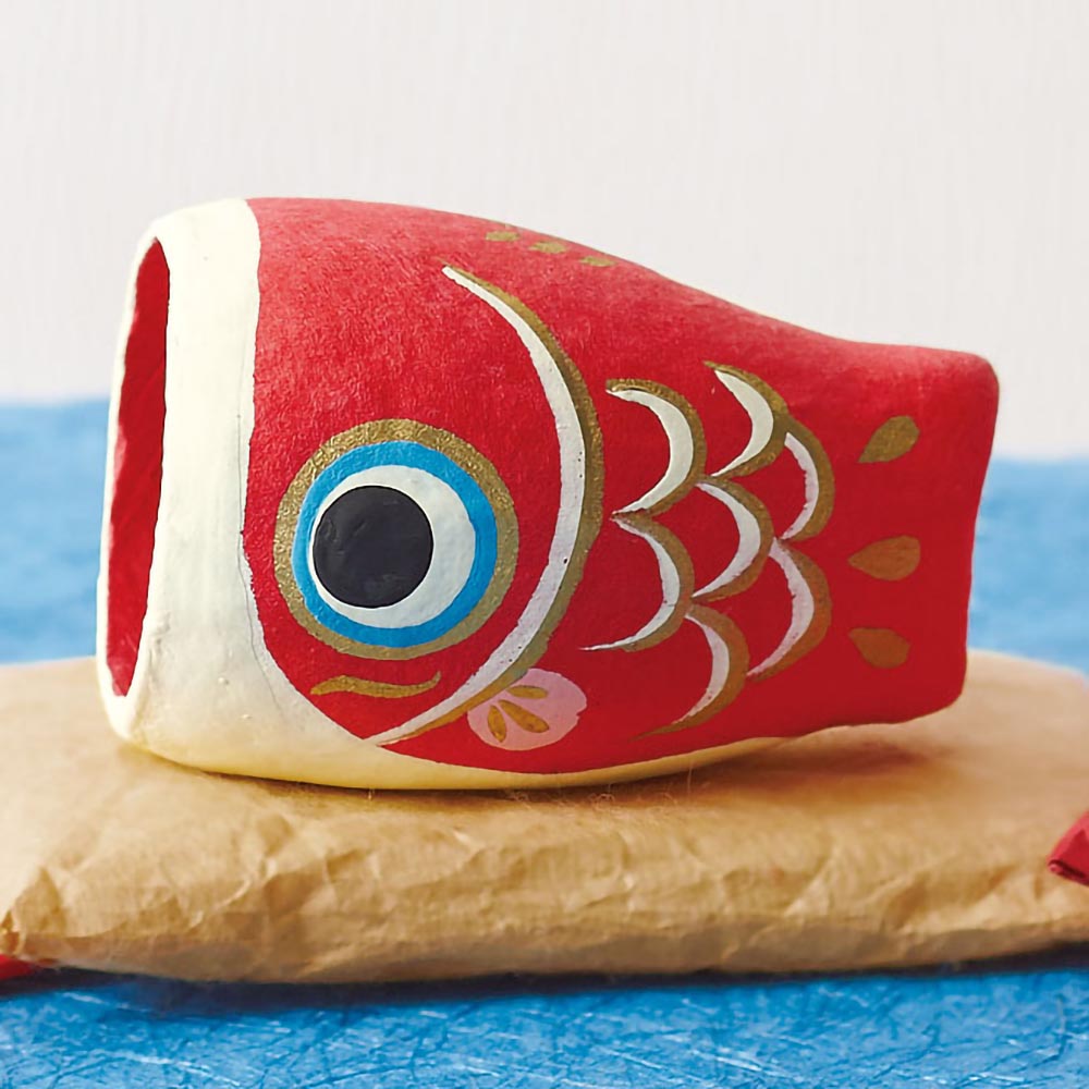 一つ一つていねいに手作りされたコロンとかわいい張り子の鯉のぼりは、付属の和紙座布団にのせて並べて飾れば個性的な節句飾りに。