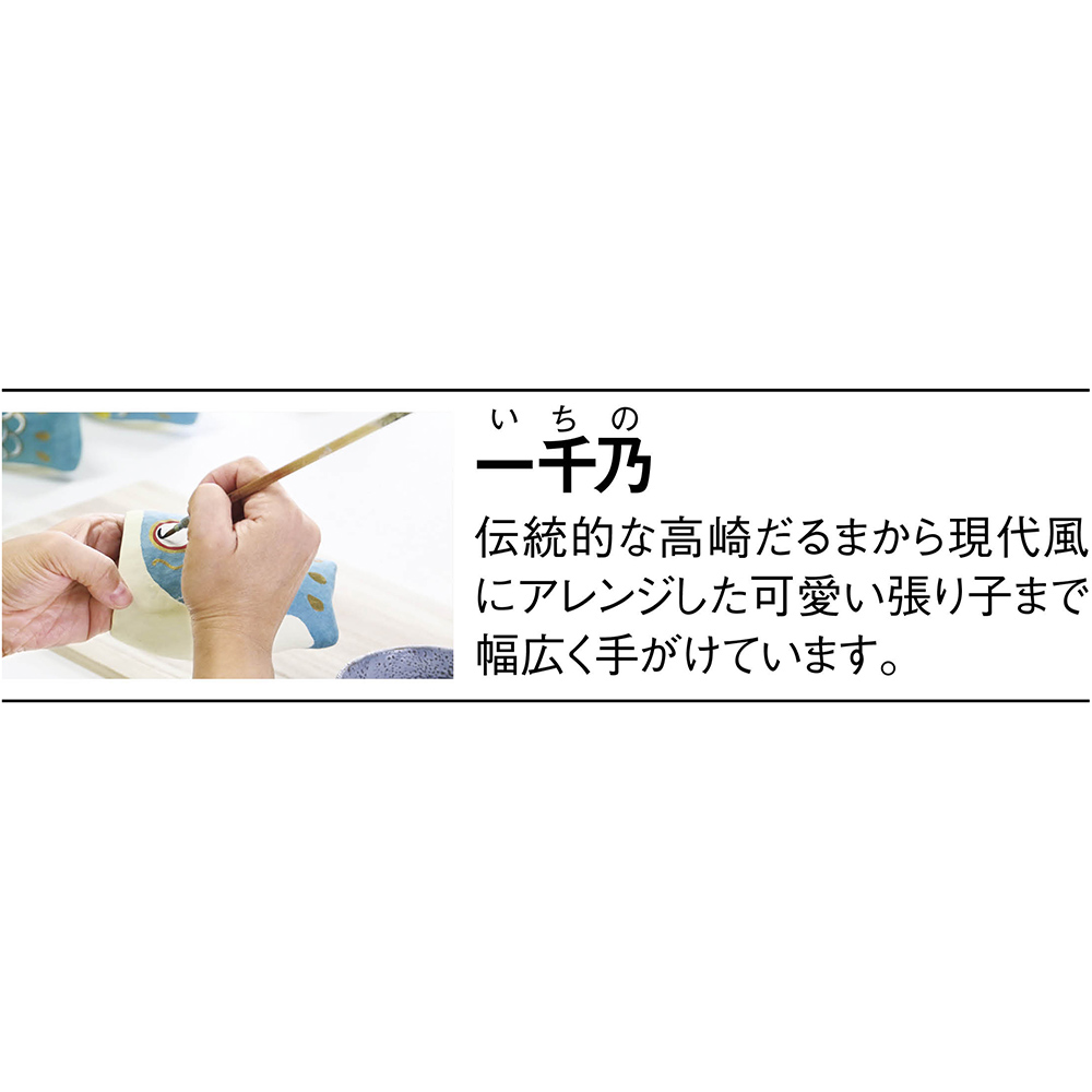 【一千乃】二百十数年あまりの歴史がある「高崎だるま」で有名な高崎市にある張り子メーカー。伝統的な高崎だるまから現代風にアレンジした可愛い張り子まで幅広く手がけています。