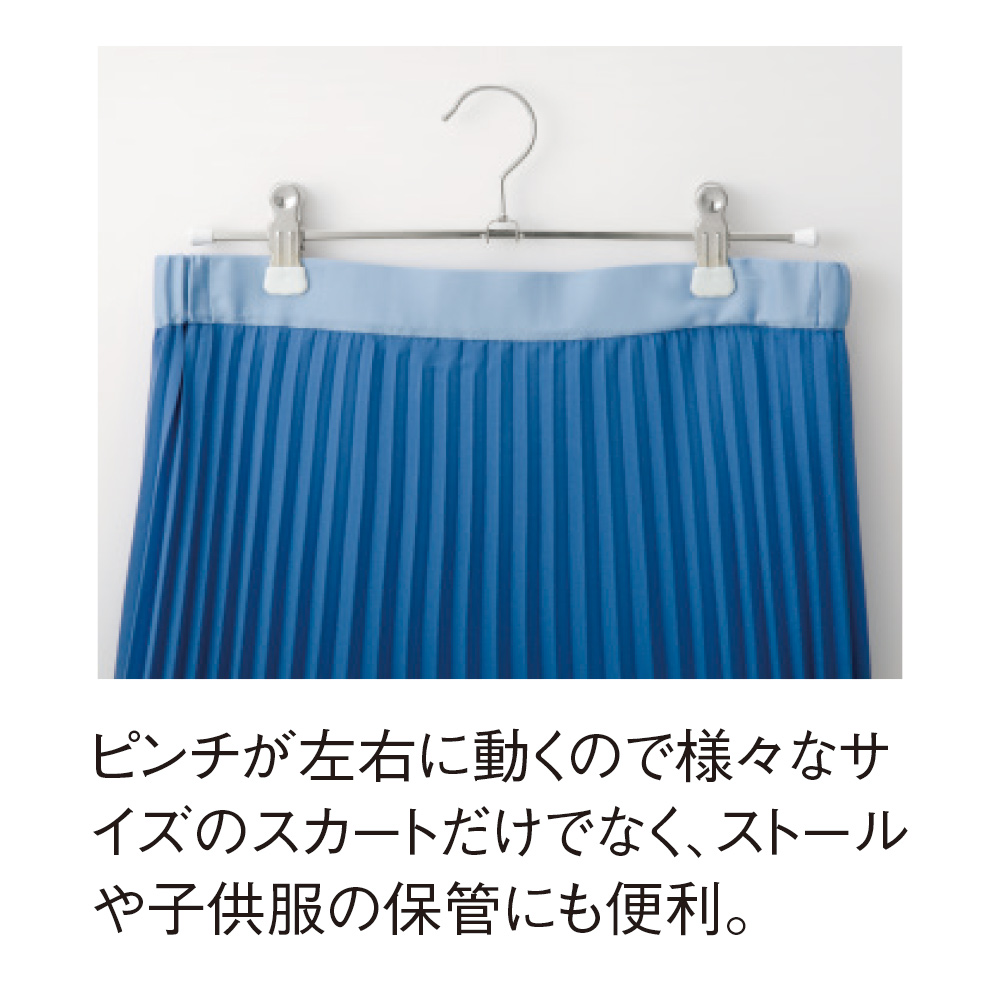 ピンチが左右に動くので様々なサイズのスカートだけでなく、ストールや子供服の保管にも便利。パンツハンガーとしても活躍します。