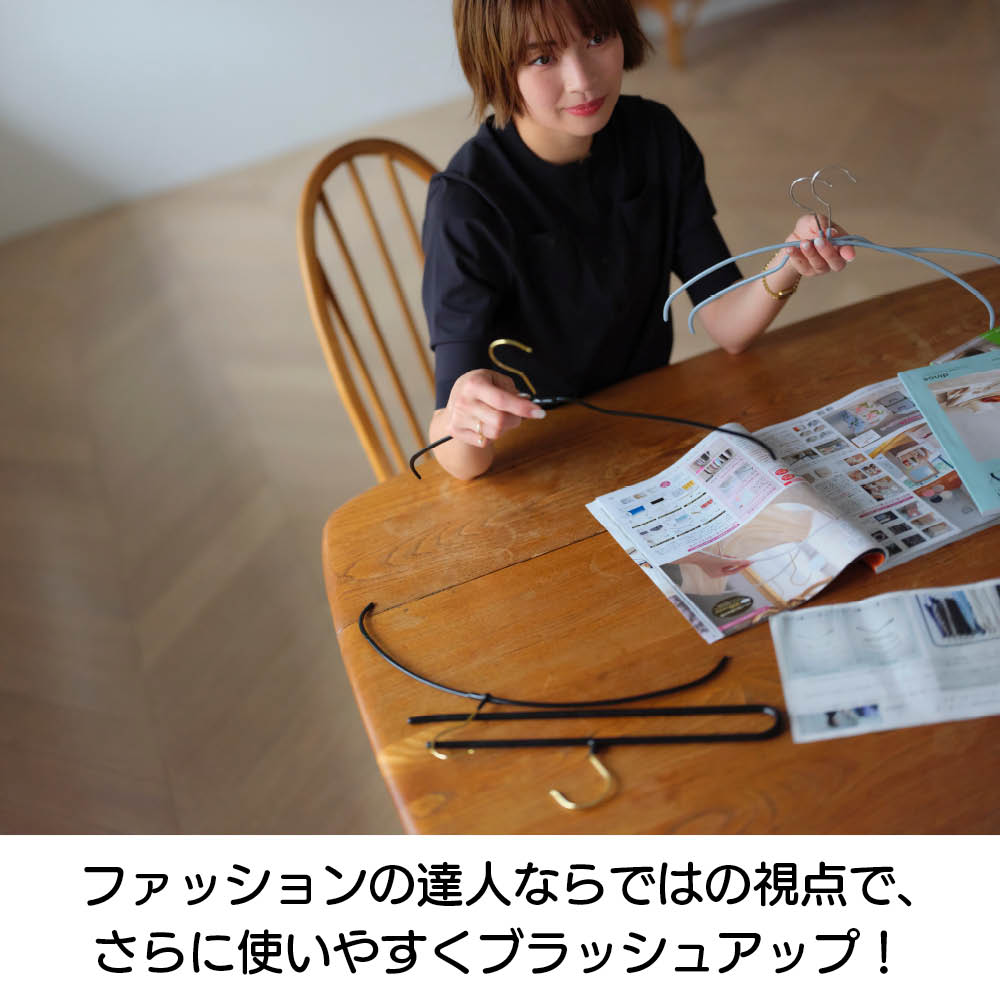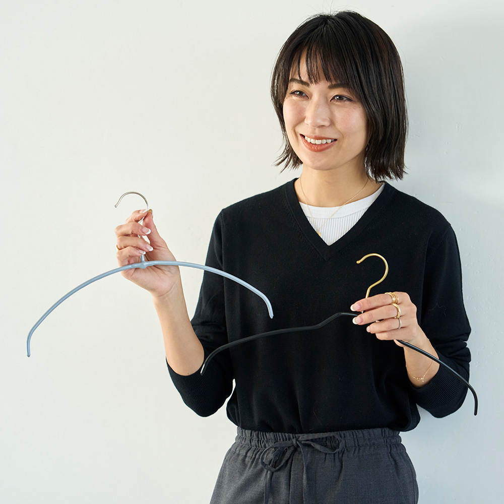 服がすべりにくいから型くずれしにくく、薄型で収納性にも優れたMAWAハンガー。収納術の本を出版するほどクローゼットにこだわりのある小山田さんが惚れ込み、スペシャルモデルをつくりました。