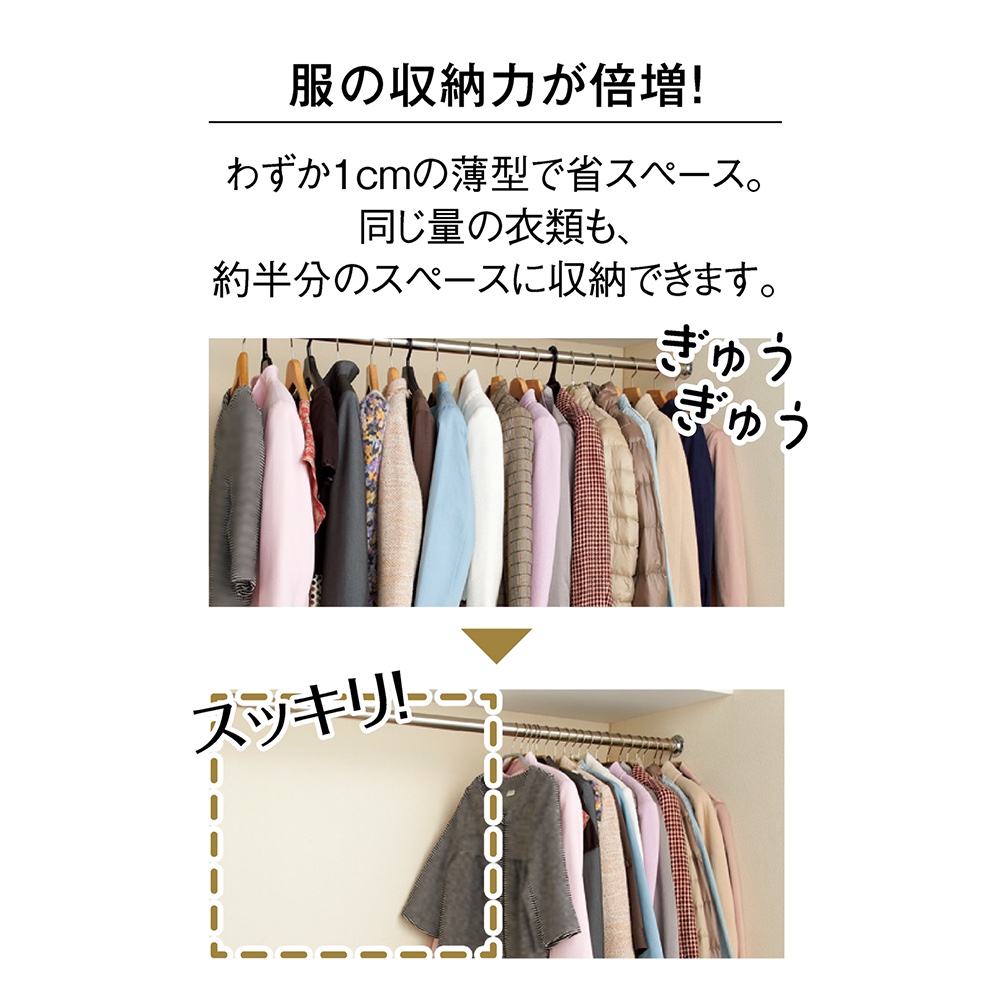 厚みはわずか約1cm。コートやジャケットがしっかり掛けられるのに場所をとらず、今までの約半分のスペースに収納可能。ギュウギュウだったクローゼットがスッキリ、快適に模様替えできます。◇ドイツ生まれのMAWA GmbH(マワ社)