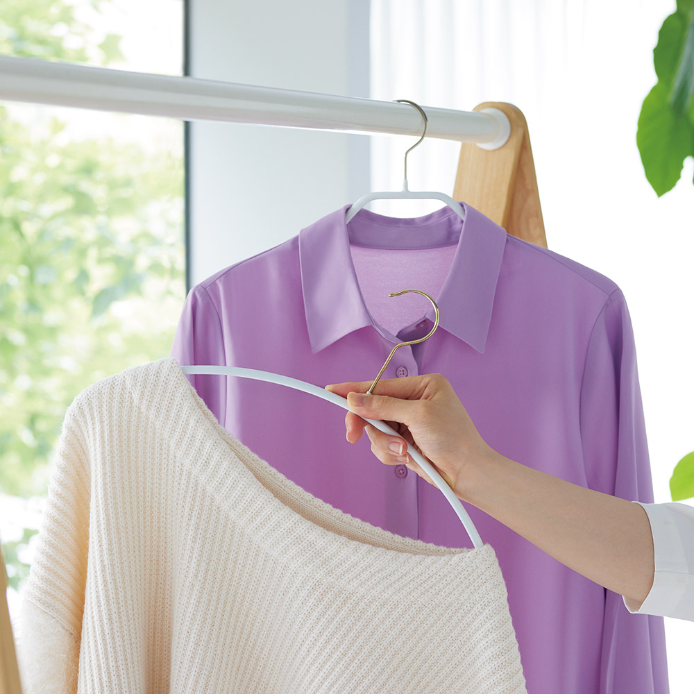 肩先に緩やかなカープを持たせたレディースハンガーとも、ニットなどの伸びやすい服をきちんとキャッチして型崩れを防ぎます。「着ようと思ったら肩がツンツン」という悩みがなくなりそう。