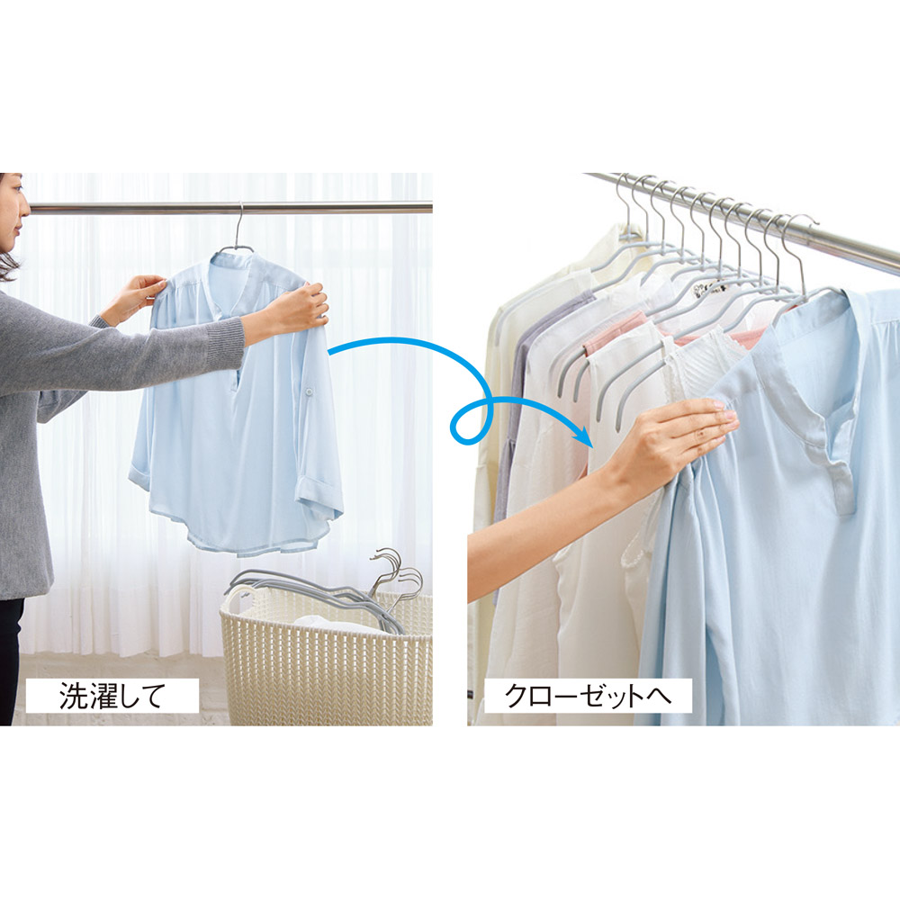 物干し竿からクローゼットへ直行!洗濯はもちろん、収納ハンガーとしても活躍。いちいち掛け替える必要がなく、時間も収納スペースも有効に!