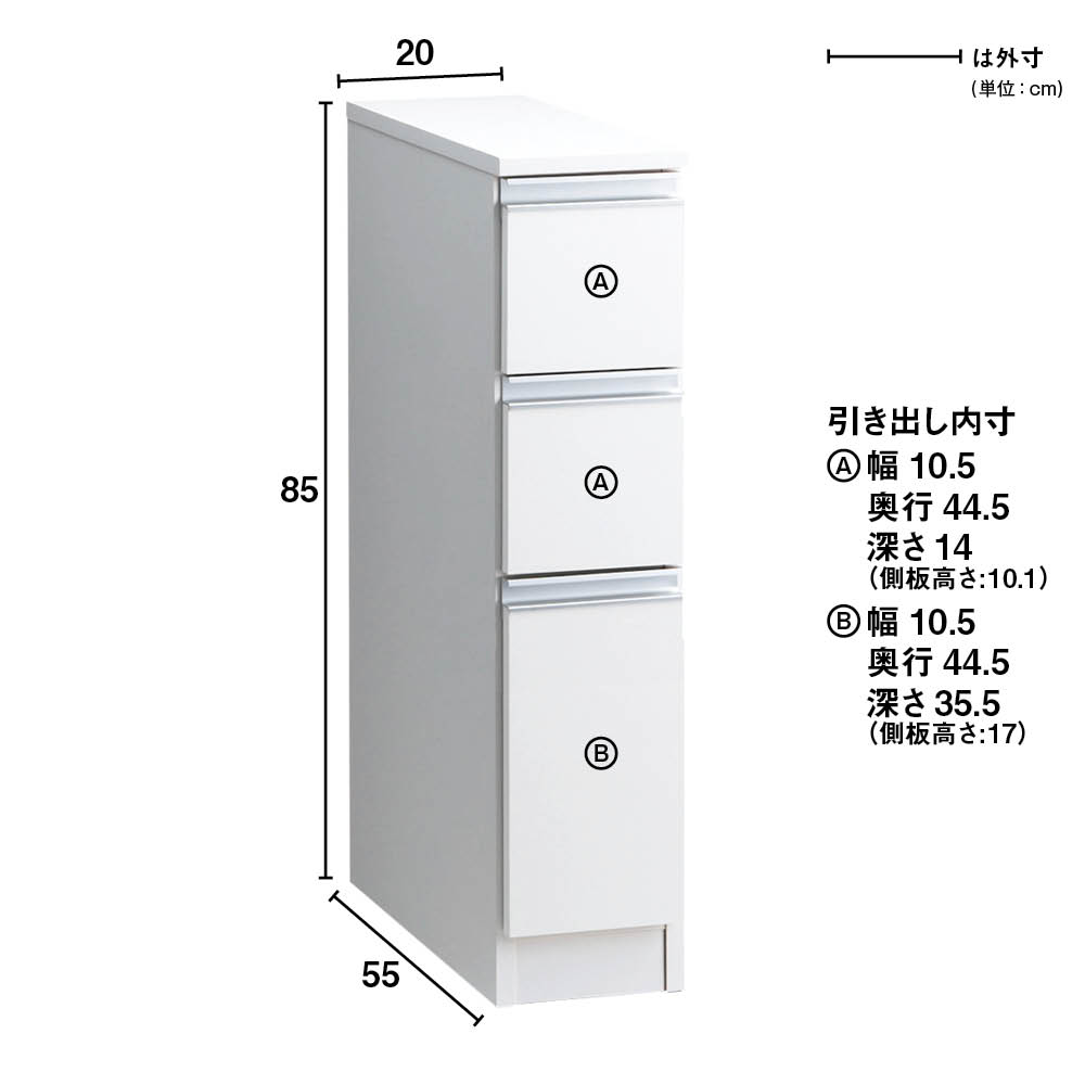 [幅20奥行55高さ85cm] キッチンすき間収納 引き出し3段 【Anyaシリーズ】 キッチンストッカー 隙間収納 キッチン収納 630127