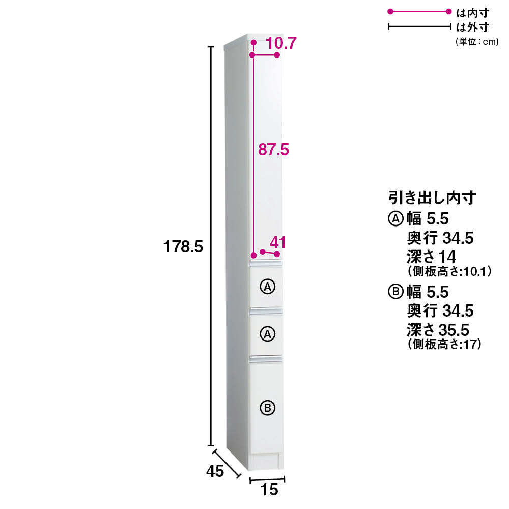 ■サイズ:幅15奥行45高さ178.5cm、引き出し内寸幅5.5奥行34.5cm