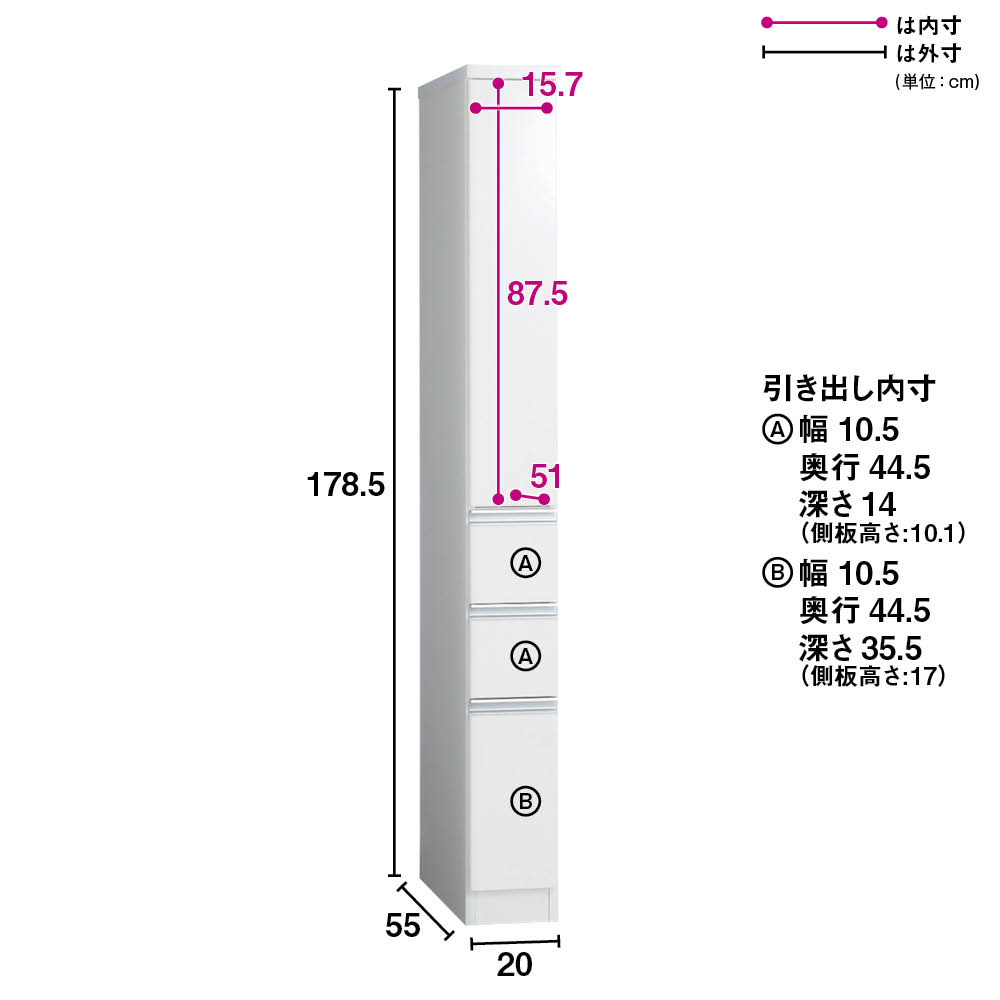 ■サイズ:幅20奥行55高さ178.5cm、引き出し内寸幅10.5奥行44.5cm