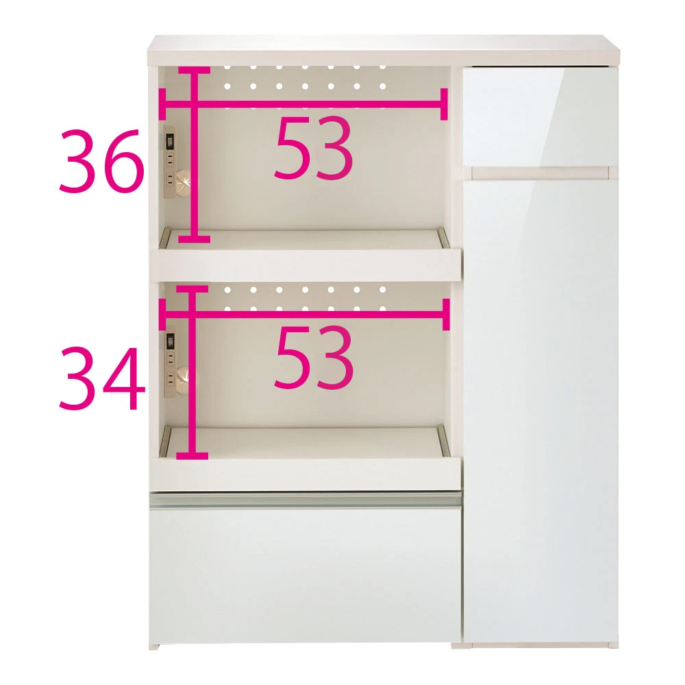 ◆下段の家電棚はスライドトレー付き。炊飯器やポット・電気ケトルなどの蒸気の出る電化製品も安心。◆オープンスペースにはスイッチ式の2口コンセントがついています。