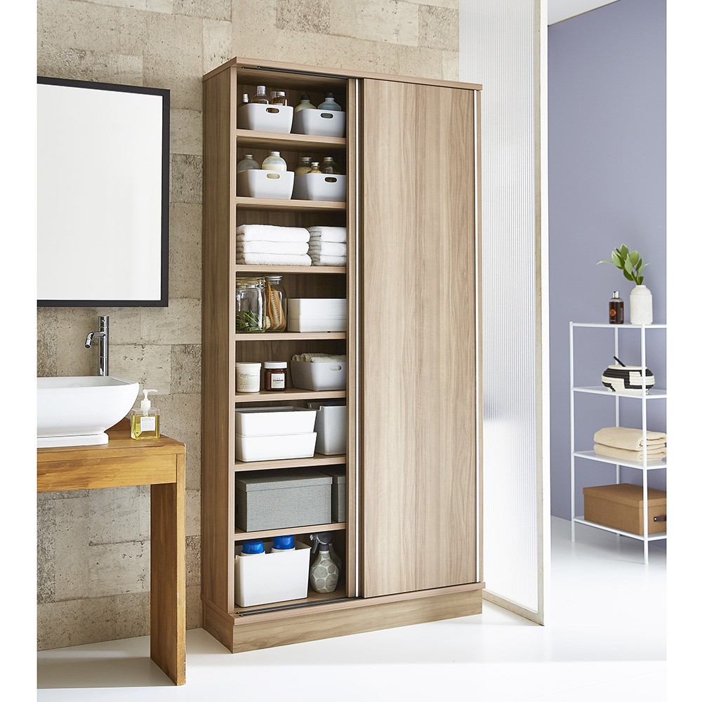 • (ア)グレーウォルナット ※写真は幅90cmタイプです。 湿気がこもりやすいランドリーには扉を開けっぱなしにできる引き戸タイプがおすすめ。