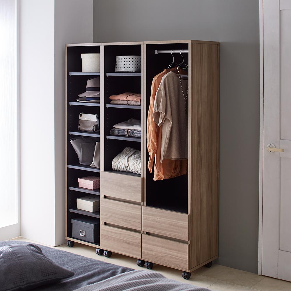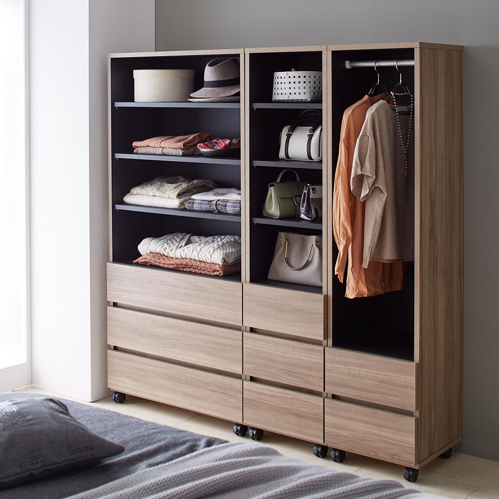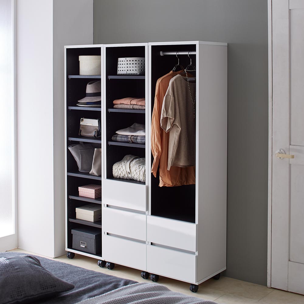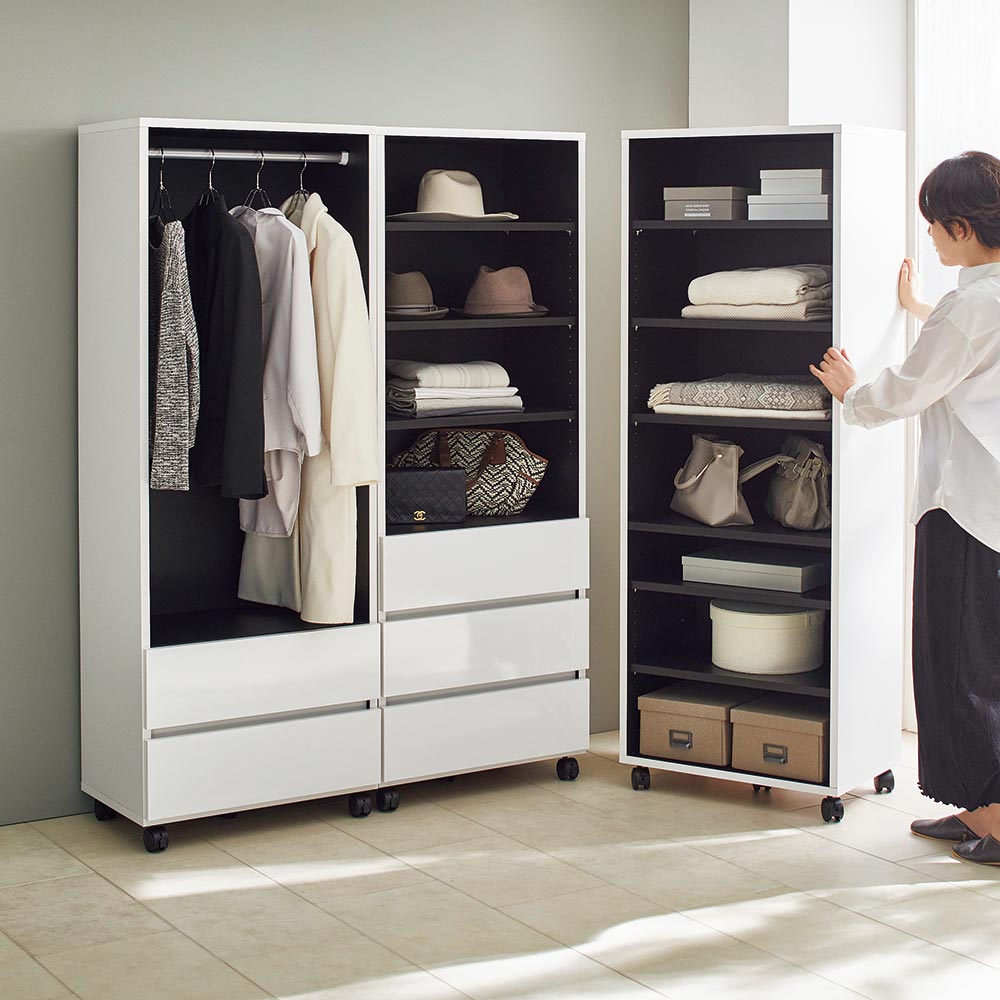 ハンガー&引き出し、棚&引き出し、棚の3タイプから選べます。幅40cm・幅60cm・幅80cmの3サイズをご用意。