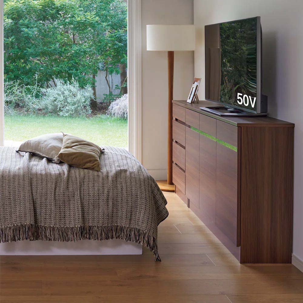 使用イメージ(エ)ブラックウォルナット ベッドの足元にも置きやすい奥行35cmの薄型設計なので、動線の邪魔になりません。 ※写真手前から別売りのテレビ台・高さ85cm幅120cmタイプ、チェスト・高さ85cm幅45cmタイプです。