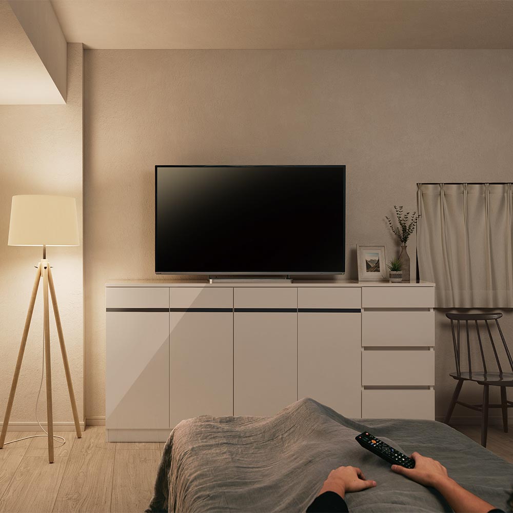 使用イメージ(ア)ホワイト お部屋に合わせて幅、高さ、カラーが選べる薄型省スペーステレビ台。寝ながらラクに見られる高さ100cmまでご用意しました。 ※写真左から別売りのテレビ台・高さ100cm幅160cmタイプ、チェスト・高さ100cm幅45cmタイプです。