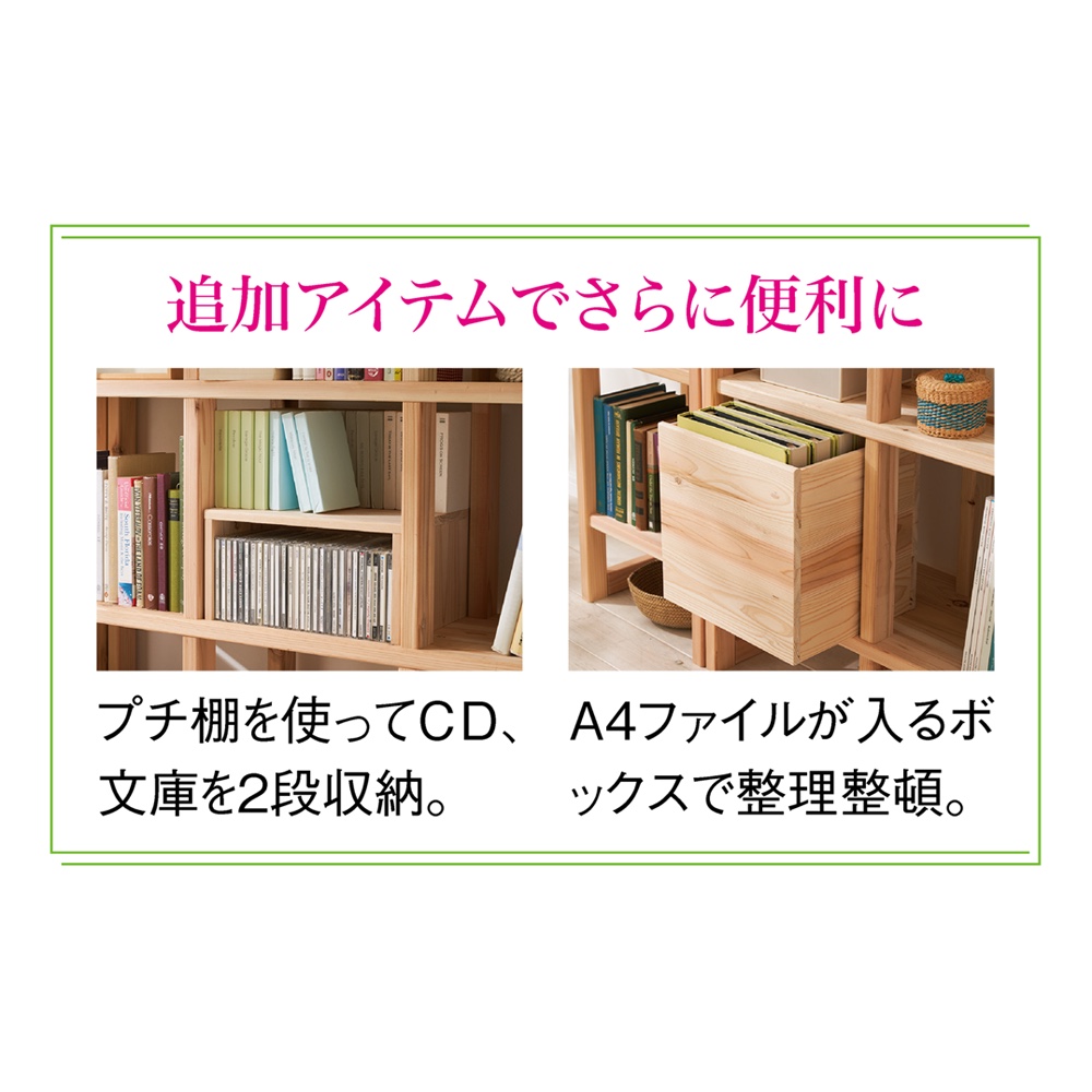 ●同シリーズの収納アイテムを組み合わせれば多彩な収納バリエーションが実現できます。●1マスを縦に仕切って収納できるプチ棚を使えばCD、文庫本を2段でしまうことができます。
