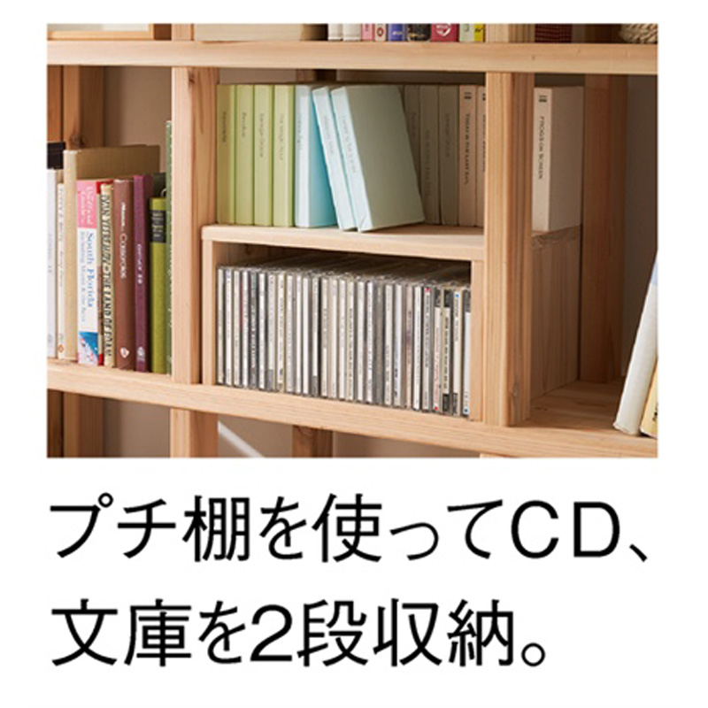 ●同シリーズの収納アイテムを組み合わせれば多彩な収納バリエーションが実現できます。●1マスを縦に仕切って収納できるプチ棚を使えばCD、文庫本を2段でしまうことができます。