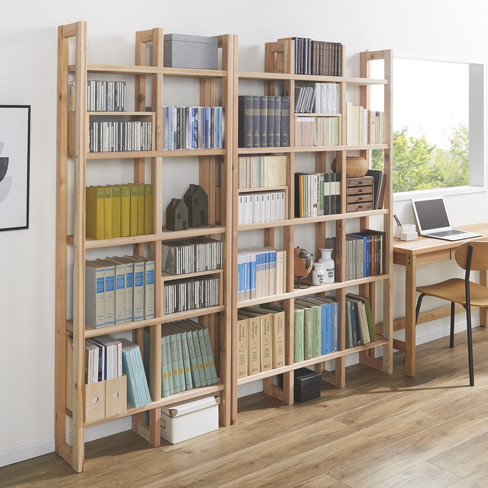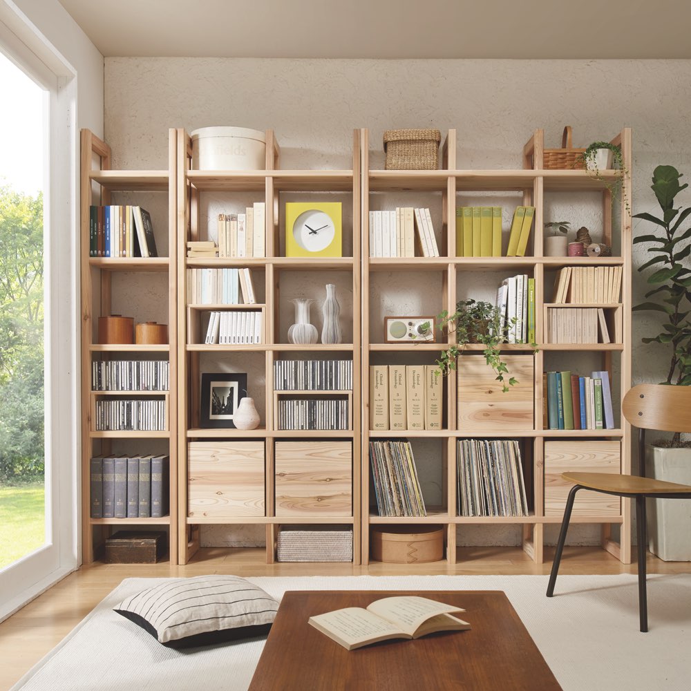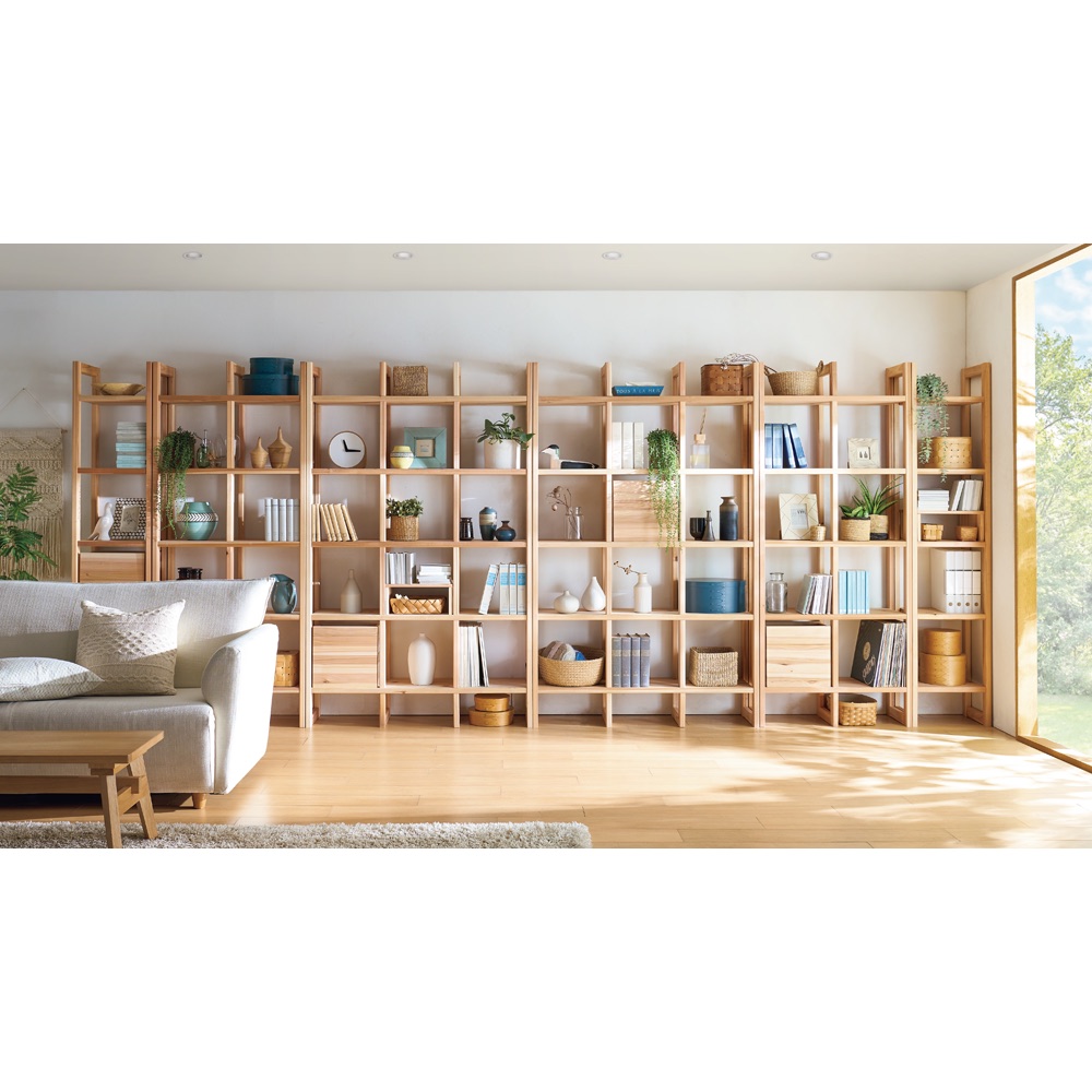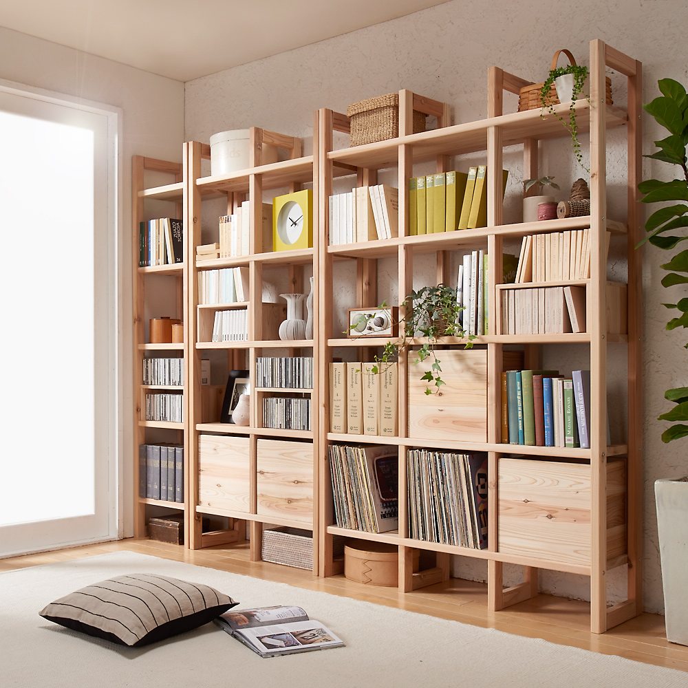 ●国産杉は、しっかり目の詰まった木質による丈夫さが特長。●建築材にも使われているこの素材をそのまま加工している書棚は、長い年月使い続けても安心の確かな耐久性を備えています。