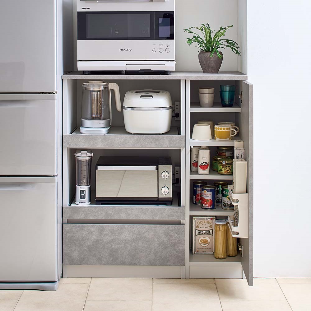 コーディネート例(ア)モードグレー 幅オーダー可能な収納棚(別売り)との使用で、壁と冷蔵庫とのすき間にぴったり設置できます。 ※写真はレンジ収納 幅60cm、幅オーダー扉収納 幅30cm設定