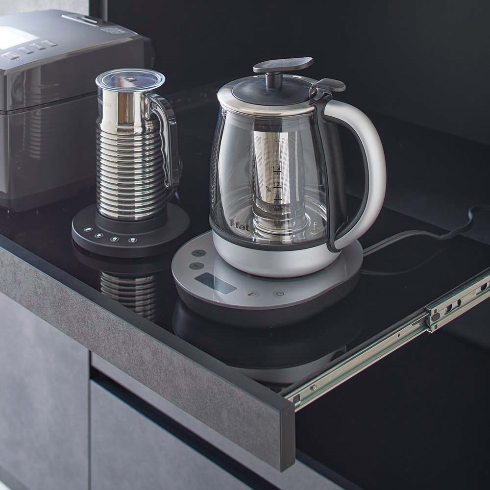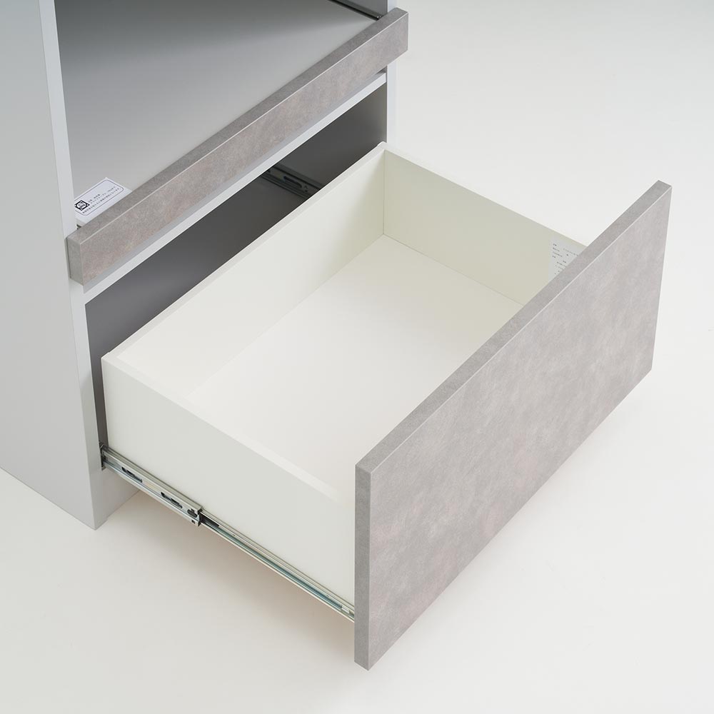 ■家電収納部、引き出しはフルスライドレール仕様で奥まで引き出せて出し入れがしやすい。