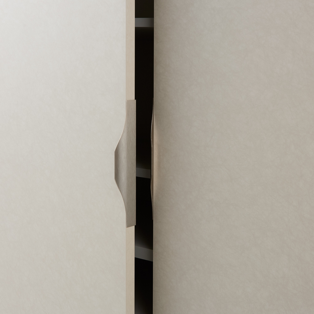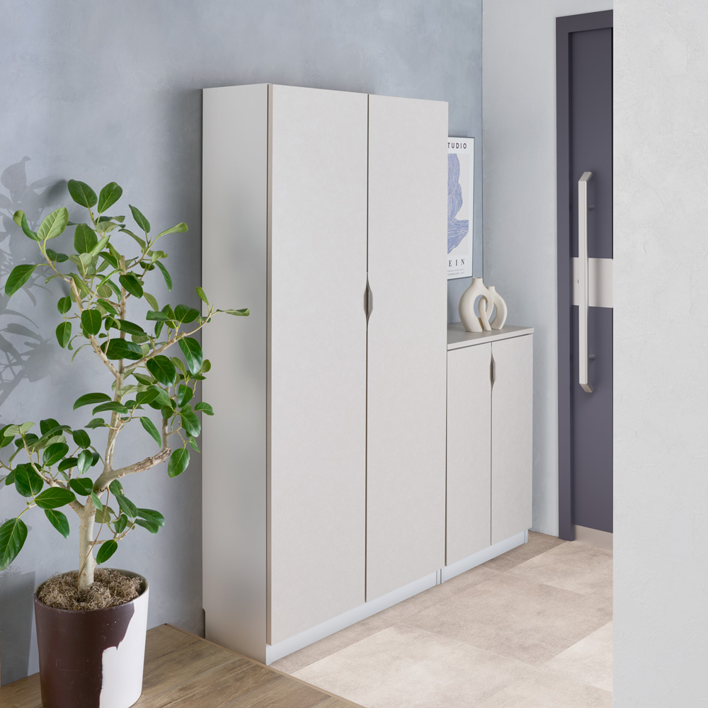 使用イメージ(ア)前面:シルクベージュ/側面・内装:ライトグレー 奥行の無駄をそぎ落として玄関を広く使える薄型。 ※写真左から幅90cm奥行32cm高さ180cmタイプ、幅60cm奥行32cm高さ90cmタイプです。