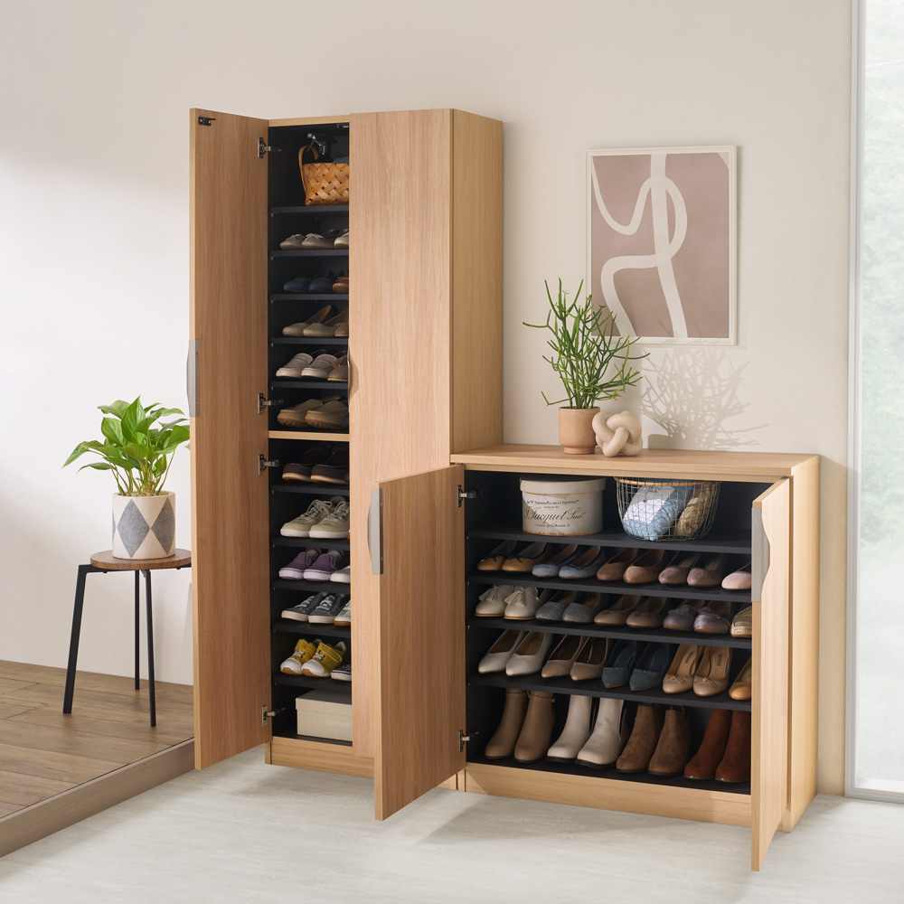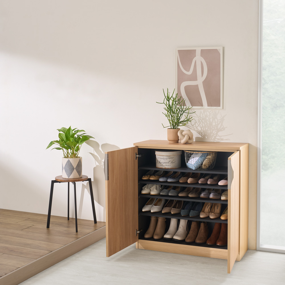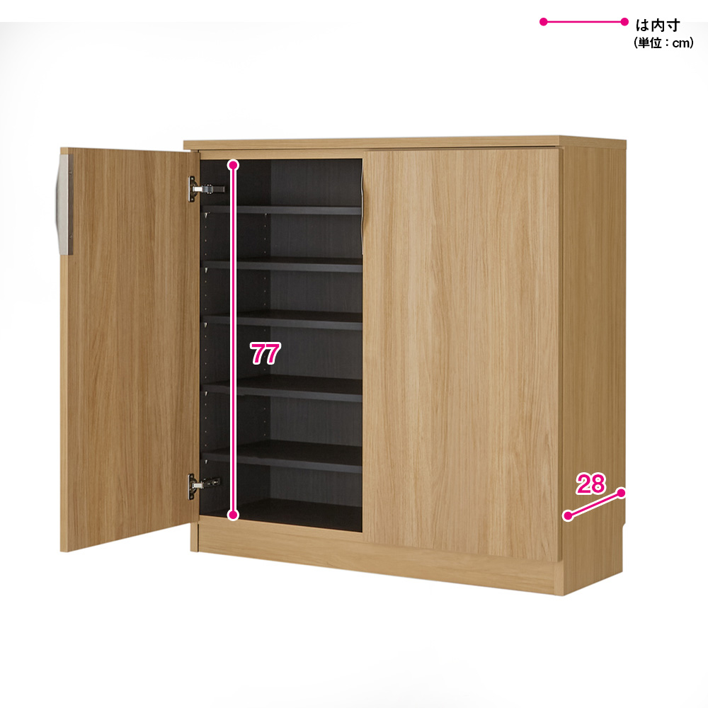 (エ)前面・側面:ナチュラル/内装:黒木目 内寸奥行28cmで、家族の靴サイズが25cm程度なら必要十分。狭い玄関もすっきりと。 ※写真はお届けする商品です。(一部棚板を外しています)