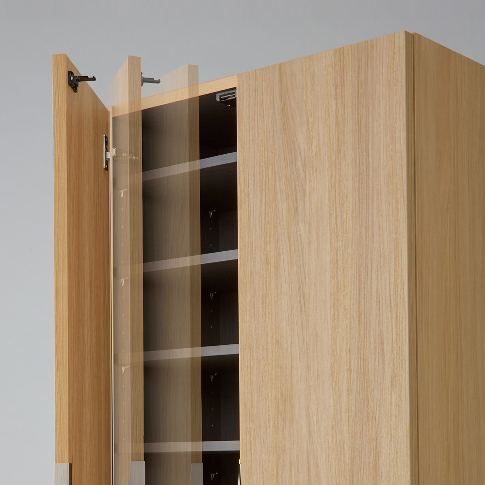 コーディネート例(エ)前面・側面:ナチュラル/内装:黒木目 限られた空間でも圧迫感がなく、可動棚板で高さも効率よく収納。 ※お届けは写真右の幅90cm奥行32cm高さ90cmタイプです。(一部棚板を外しています)