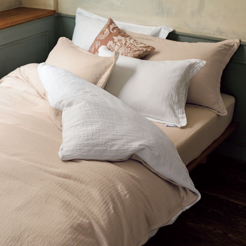 布団にくるまる時、その感触はとても大切。「和ざらし二重ガーゼの掛け布団カバー」の素材は、昔ながらの製法で仕上げた綿100%の二重ガーゼ。使えば使うほど、洗えば洗うほど、ほんのりと起毛しながら、ぬくもりのある風合いに育っていき、心まで満たされるやさしい使い心地になっていきます。