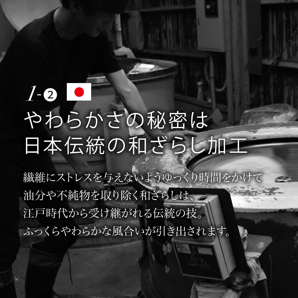 「和ざらし」という言葉をご存知ですか?繊維にストレスを与えないよう、ゆっくり時間をかけて油分や不純物を取り除く伝統の技法。江戸時代から受け継がれてきたこの方法で、ふっくらやわらかな風合いが引き出されます。