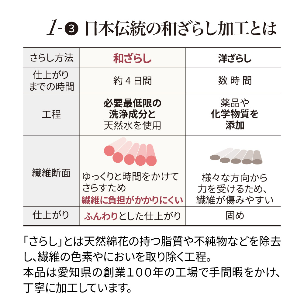 「さらし」とは、天然綿花が持っている脂質や不純物などを除去し、繊維の色素やにおいを取り除く工程のこと。この和ざらしされた二重ガーゼ生地は、創業100年の老舗工場で、手間暇かけて丁寧に加工しています。長い歴史の中で培われた技術が活かされた一枚です。