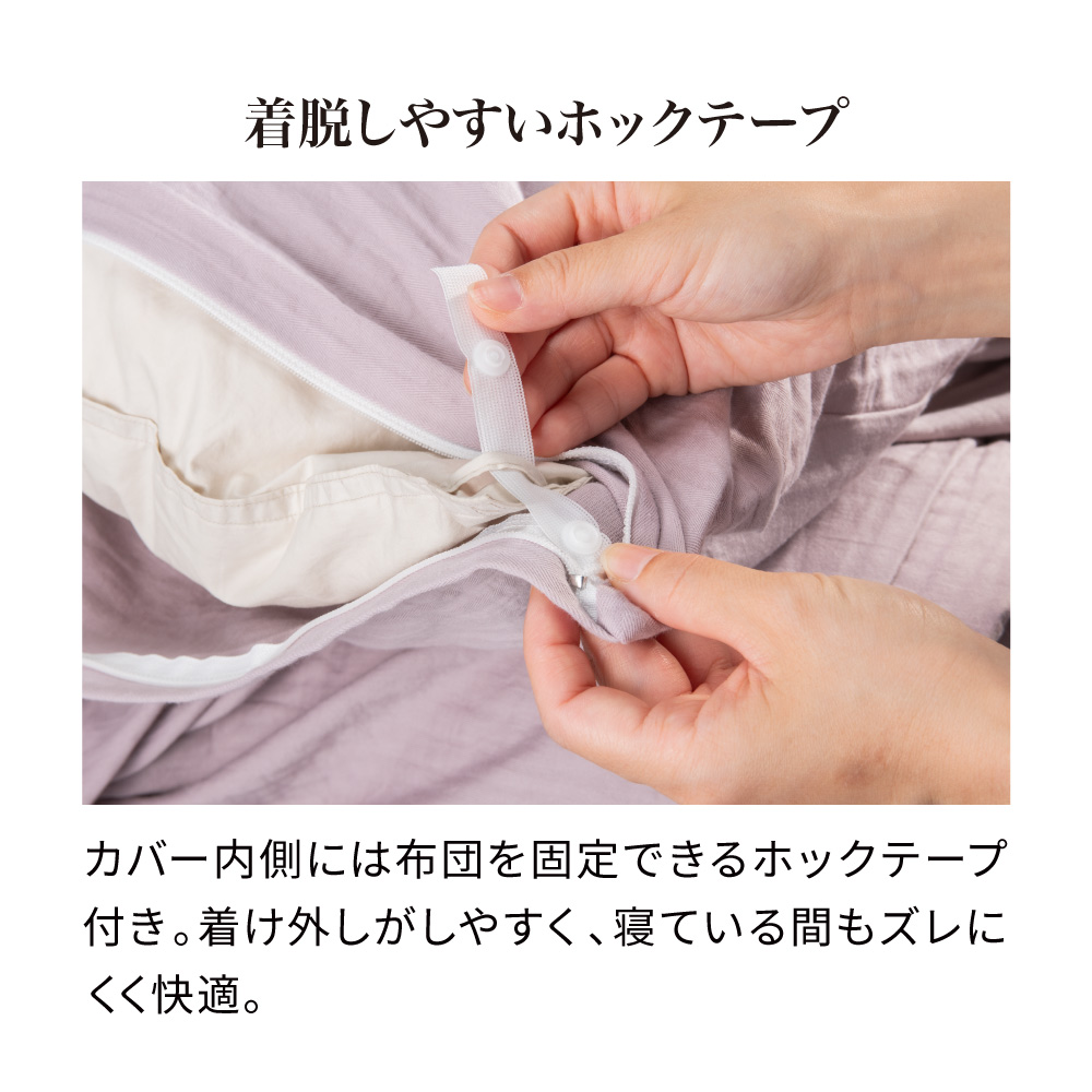 カバー内側には、布団をしっかり固定できるホックテープをつけました。着け外しがスムーズなのはもちろん、寝ている間の気になるズレも防いでくれます。