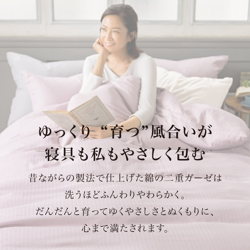 上質な綿100%二重ガーゼは、お洗濯のたびに繊維がやわらかくなり、空気を含んでふっくら育ちます。あなただけの風合いが、毎日の眠りをやさしく包み込みます。